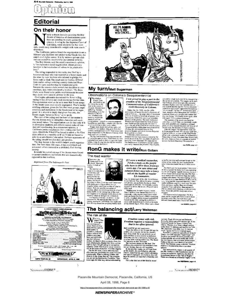 8 Apr 1998, page A-6: My turn: Observations on Coloma’s Sesquicentennial – more than 20,000 people attended the two-day event, the people of California received many gifts, including a new library