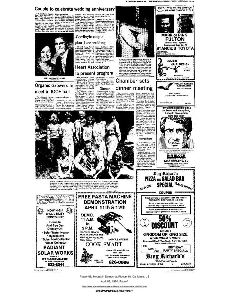 8 Apr 1998, page A-4: My turn: Observations on Coloma’s Sesquicentennial – more than 20,000 people attended the two-day event, the people of California received many gifts, including a new library