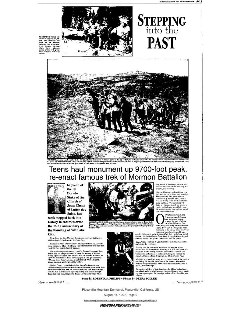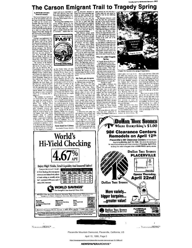 15 Apr 1999, page A-3: The Carson Emigrant Trail to Tragedy Spring – Mormon Battalion connections with the Carson Emigrant Trail, the Mormon Emigrant Trail, Sly Park, and Tragedy Spring