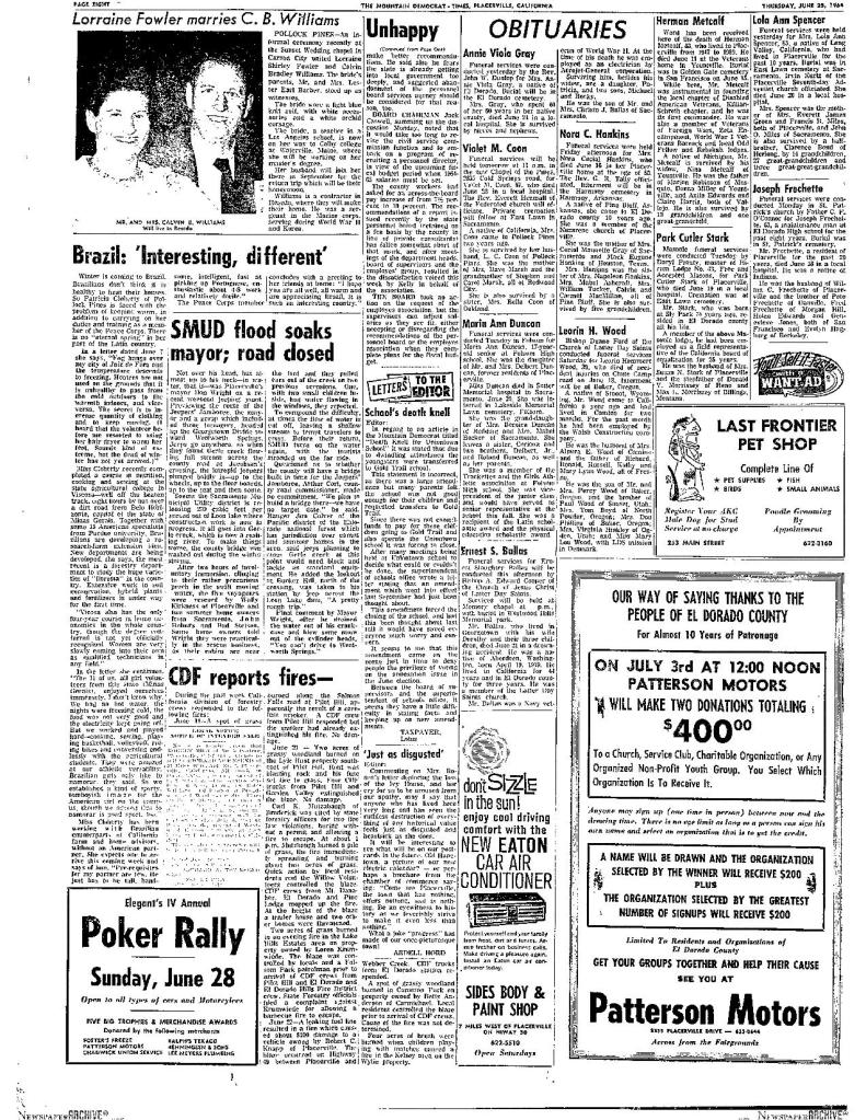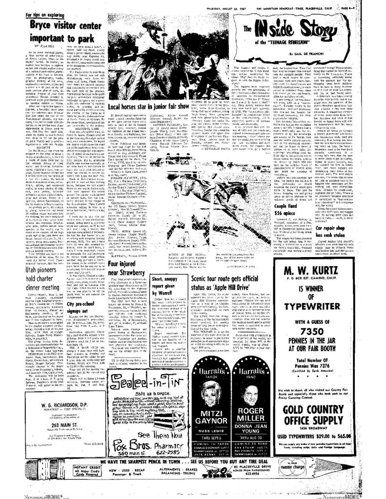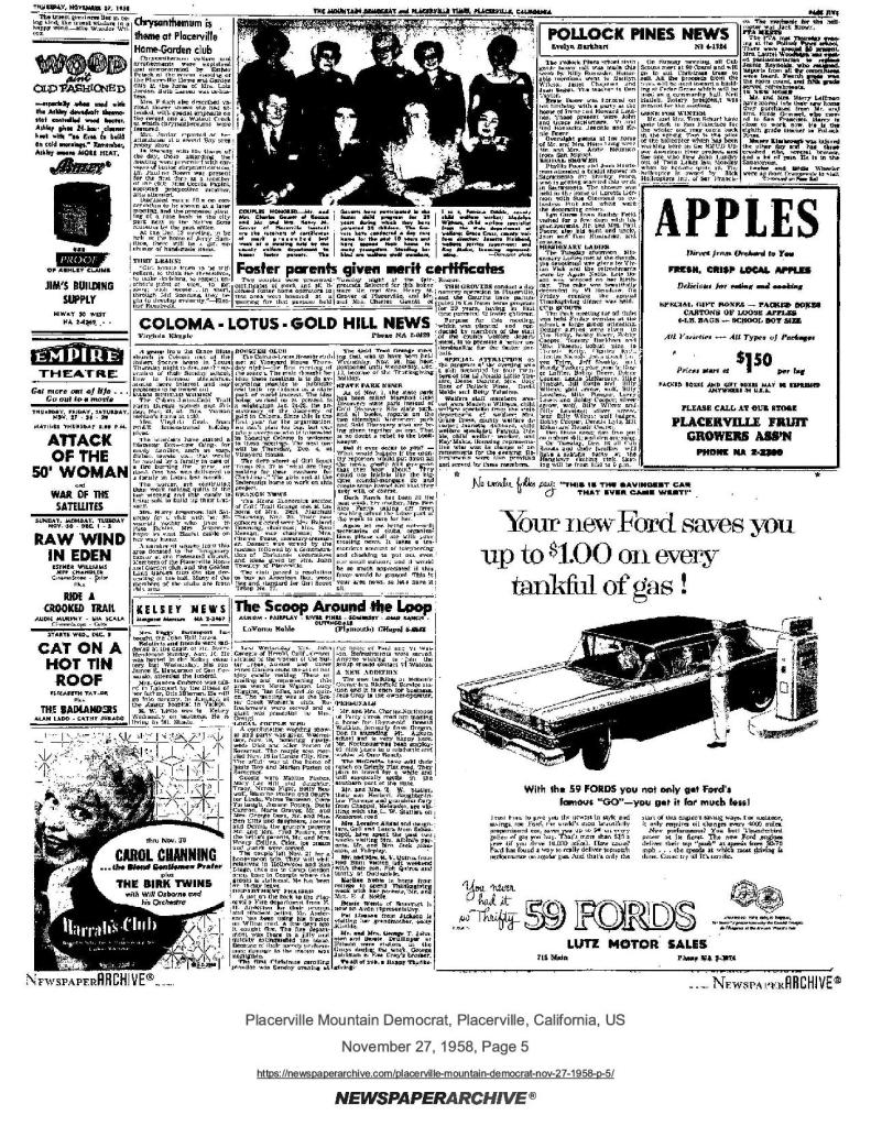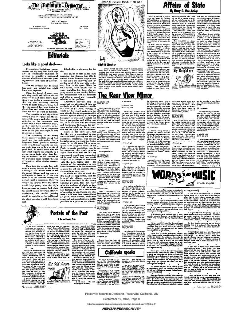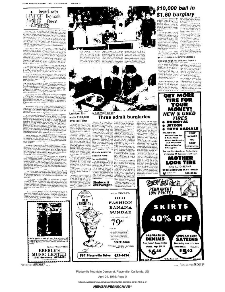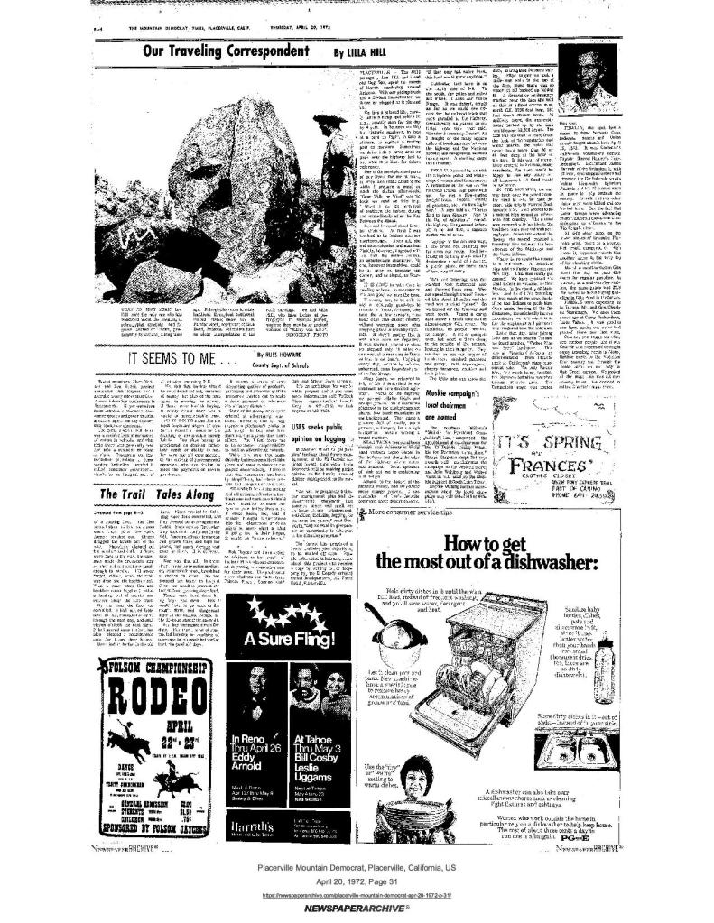 24 Apr 1975, page A-2: heard…over the back fence – SUP bid to include 49er tree on Mormon Emigrant Trail in book on historic and famous trees of U.S.