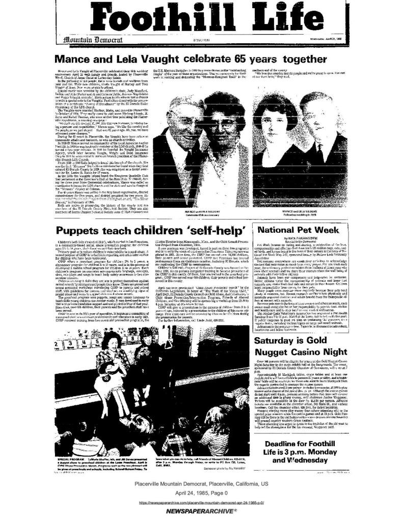 24 Apr 1985, page B-1: Mance and Lela Vaught celebrate 65 years together (photos) – Placerville Ward hosts gathering of 250 from near and far