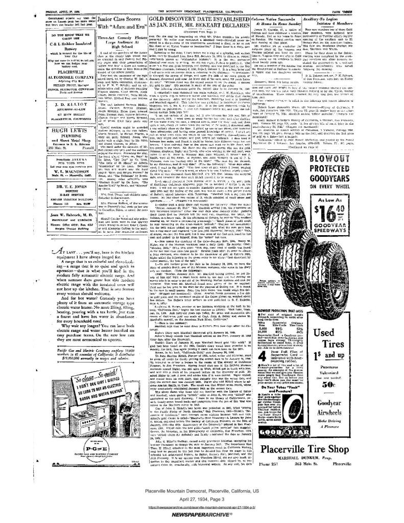 27 Apr 1934, page 3: Gold Discovery date established as Jan. 24th – diary of Mormon Battalion member, Henry W. Bigler clinches the date