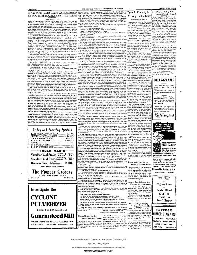 27 Apr 1934, page 4: Gold Discovery date established as Jan. 24th – diary of Mormon Battalion member, Henry W. Bigler’s clinches the date