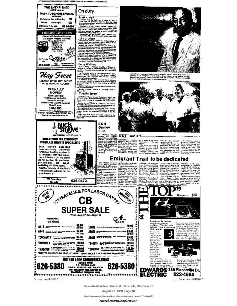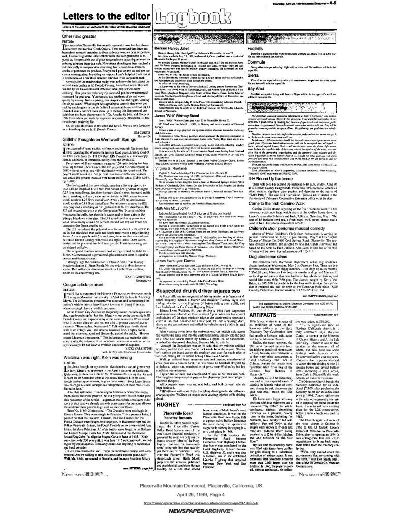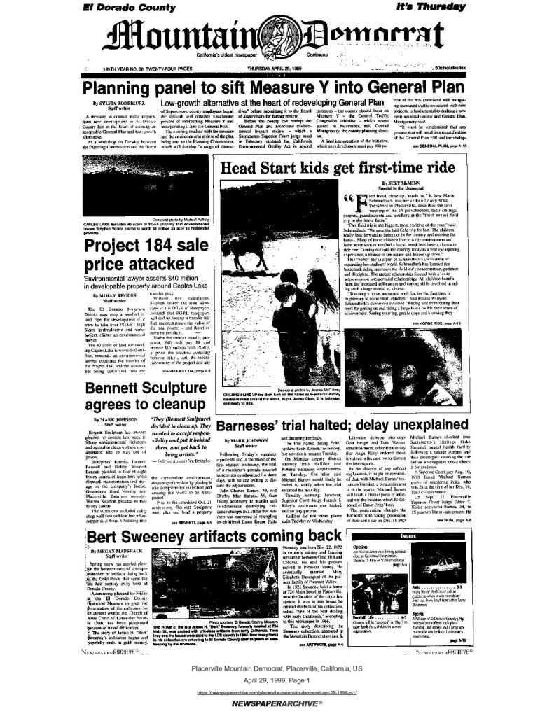 29 Apr 1999, page 1: Bert Sweeney artifacts coming back – El Dorado County Historical Museum to receive artifacts from The Church of Jesus Christ of Latter-day Saints