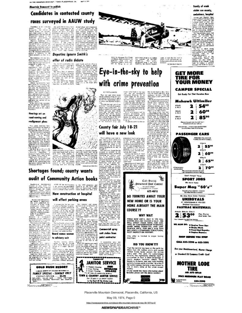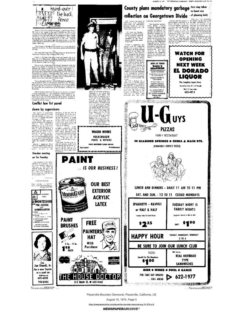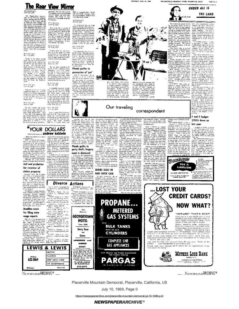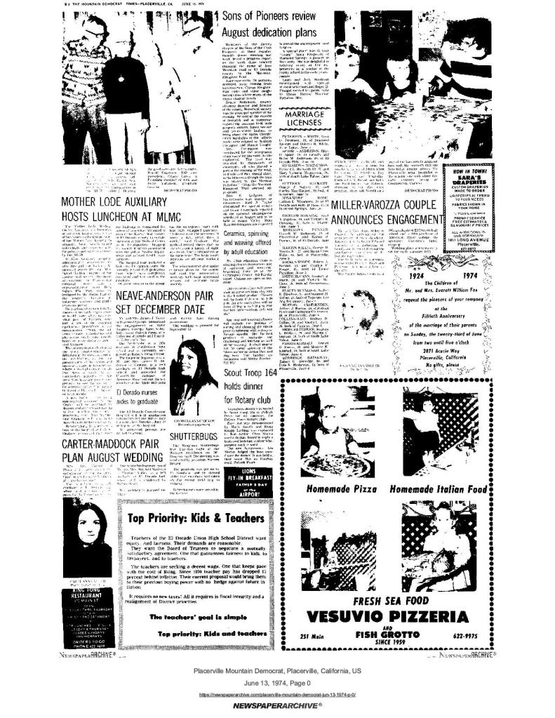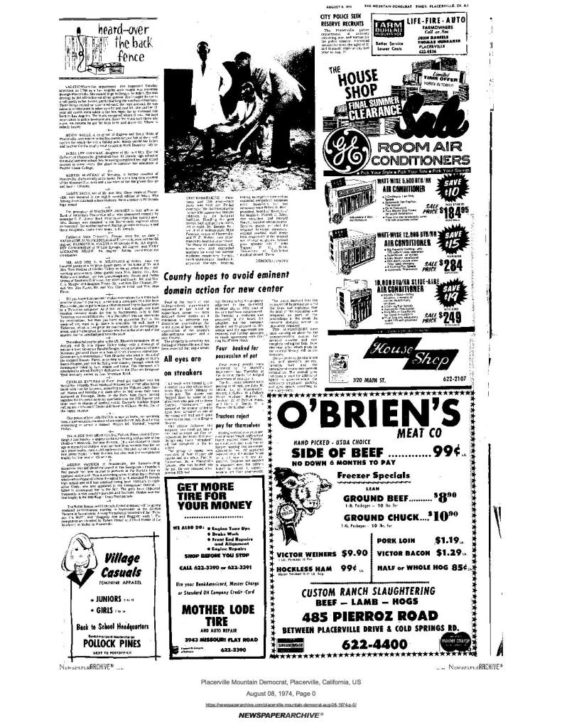 8 Aug 1974, page A-3: heard…over the back fence – Rhoades Grimshaw flying to Squaw Valley with message of welcome from Governor Ronald Reagan to 150 plus at national SUP convention and dedication