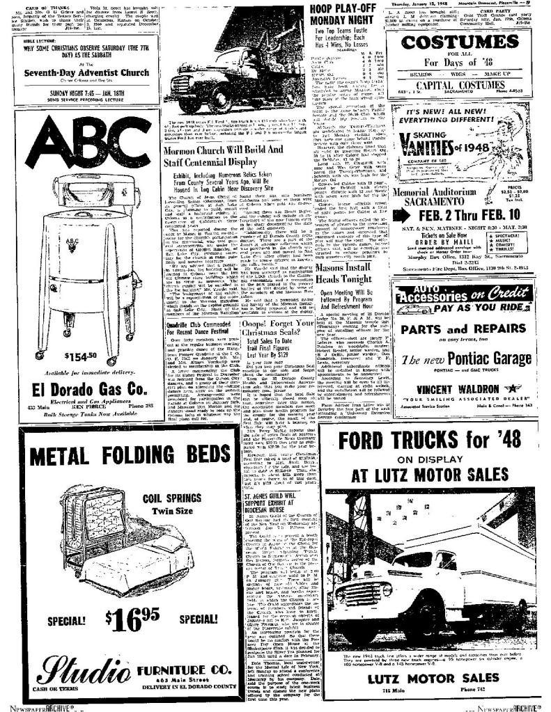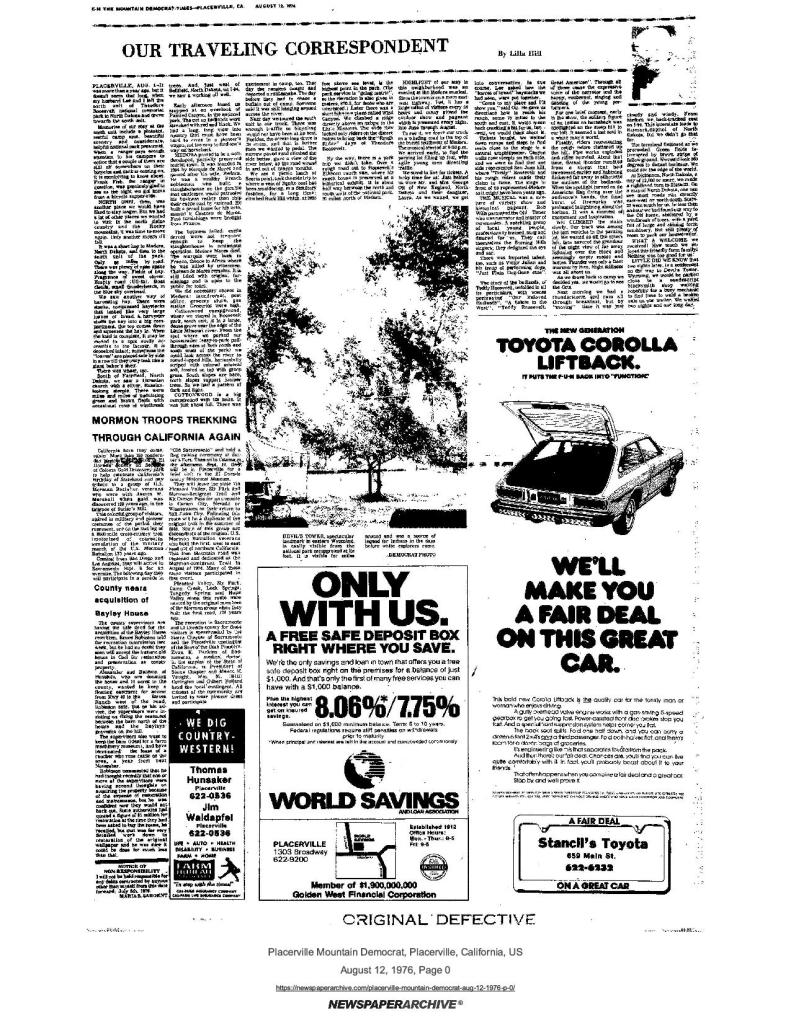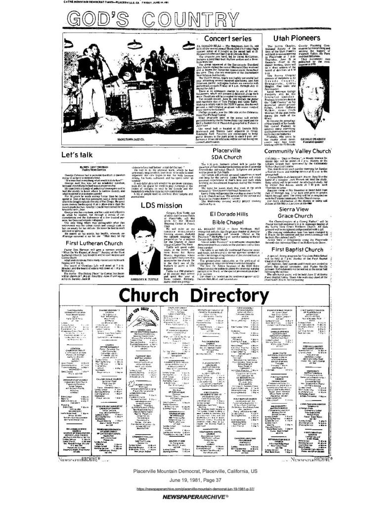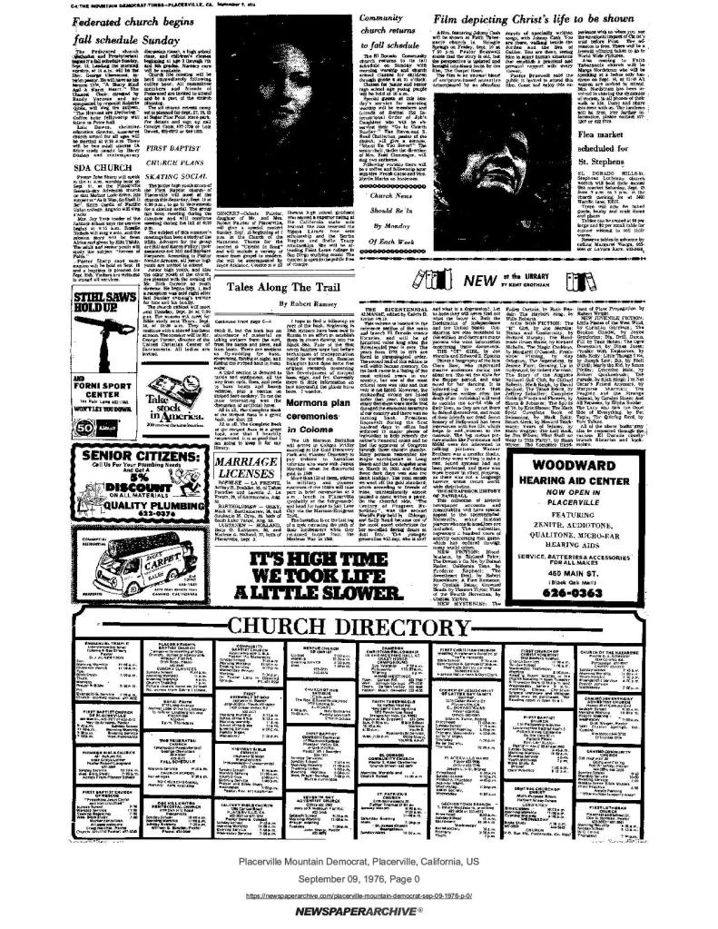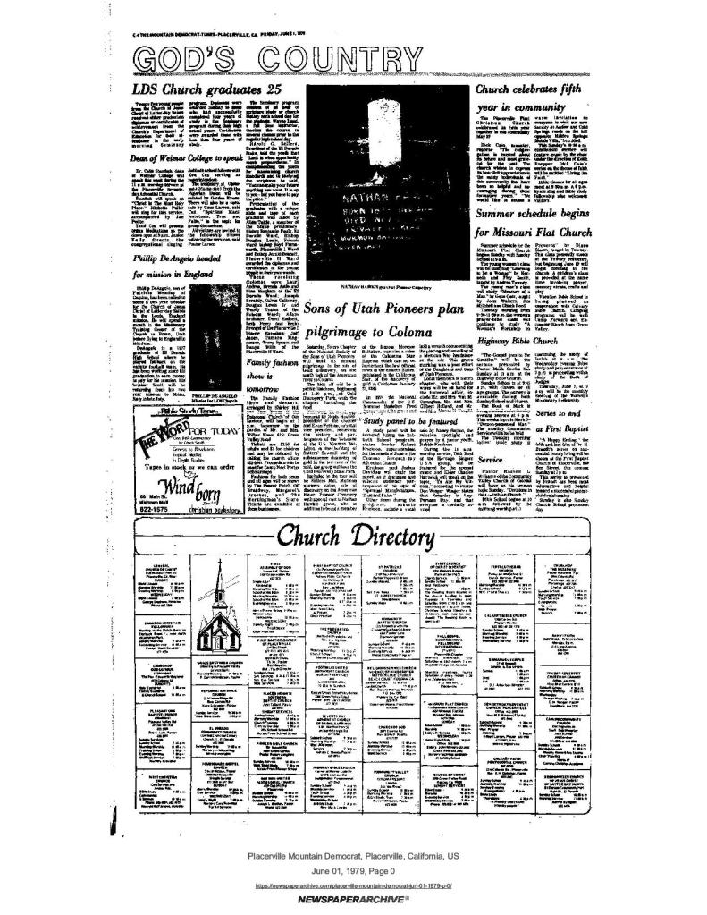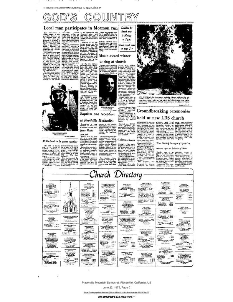 6 Mar 1969, page B-6: Church of Jesus Christ of Latter-day Saints (photo) – Placerville Ward history, begins with Mormon Battalion