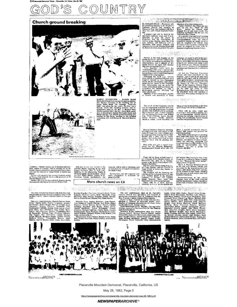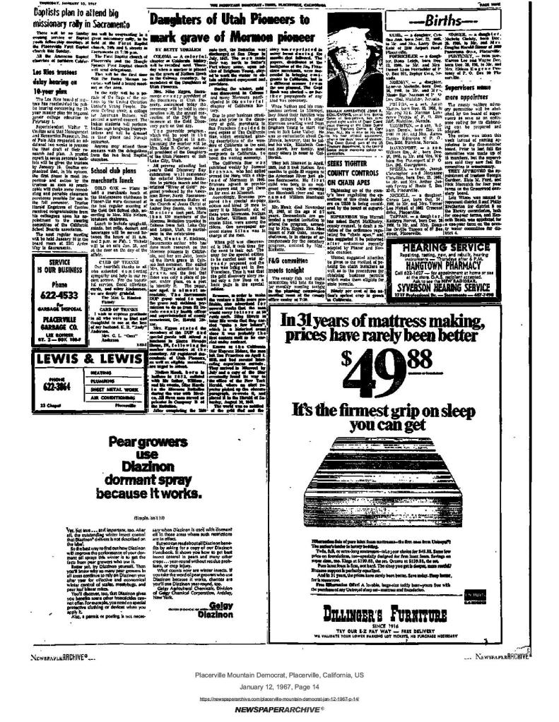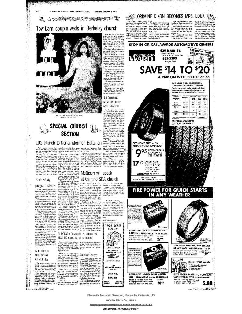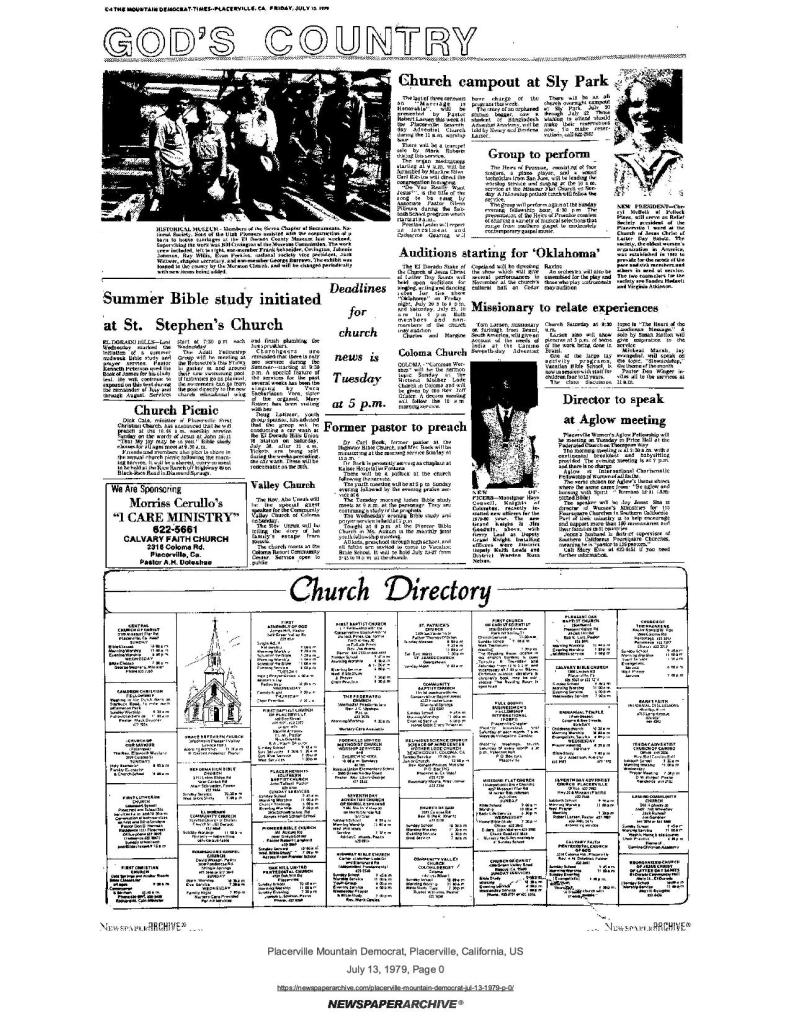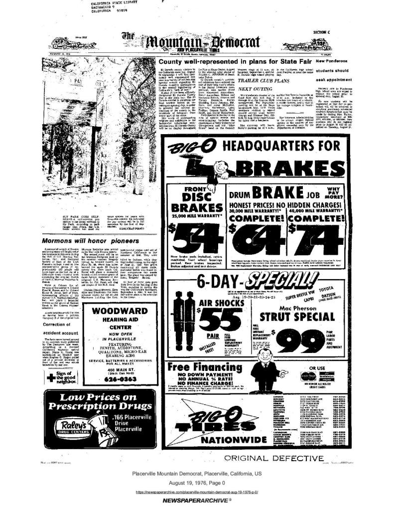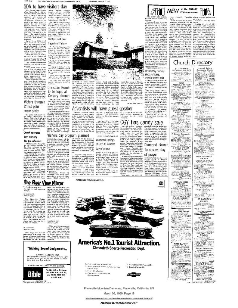 6 Mar 1969, page B-6: Church of Jesus Christ of Latter-day Saints (photo) – Placerville Ward history, begins with Mormon Battalion
