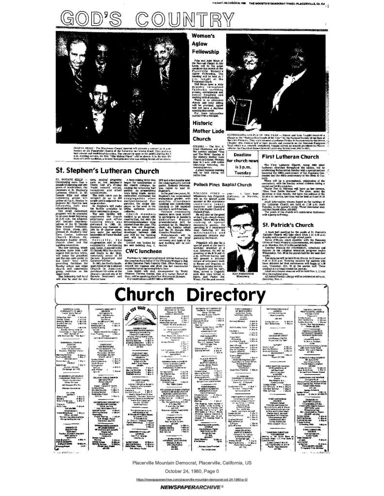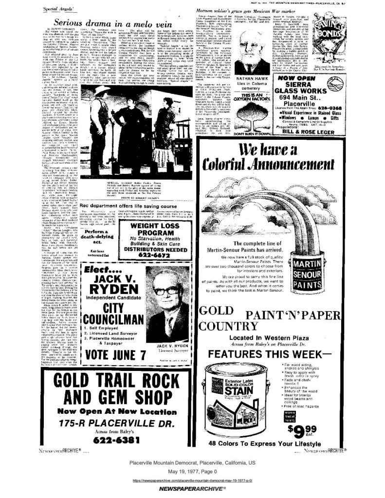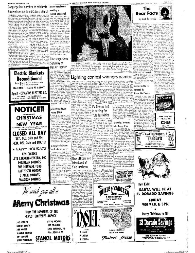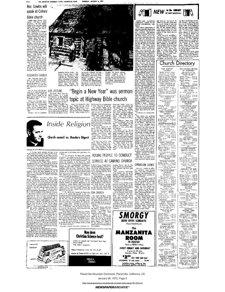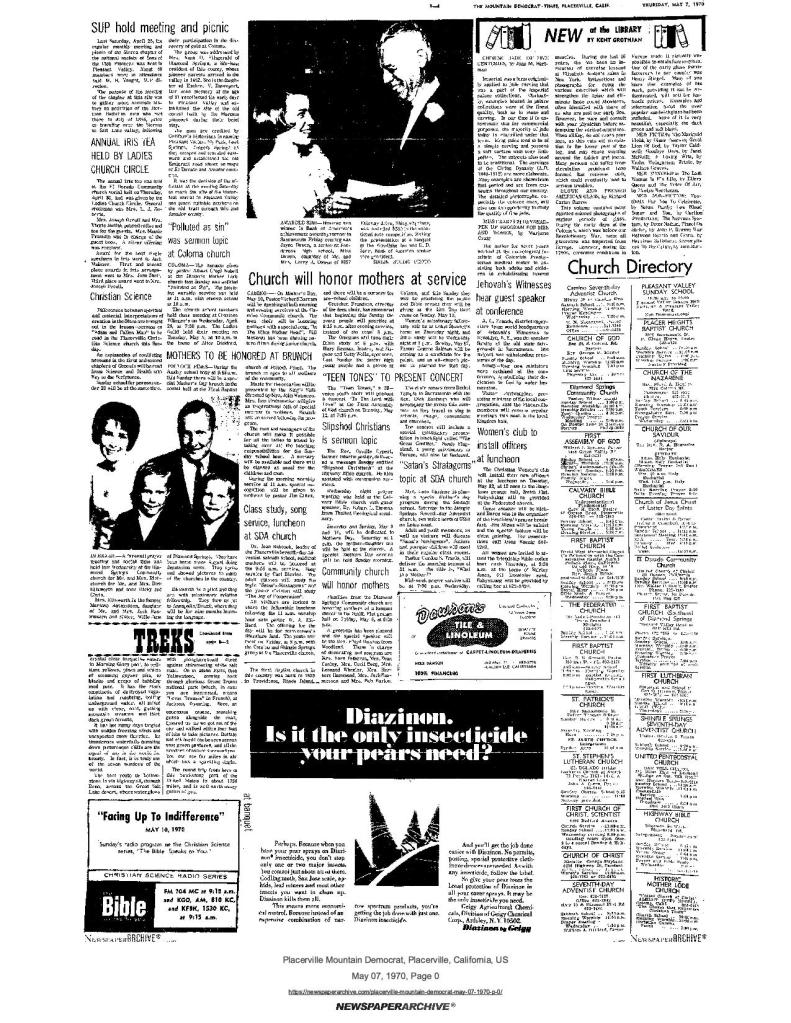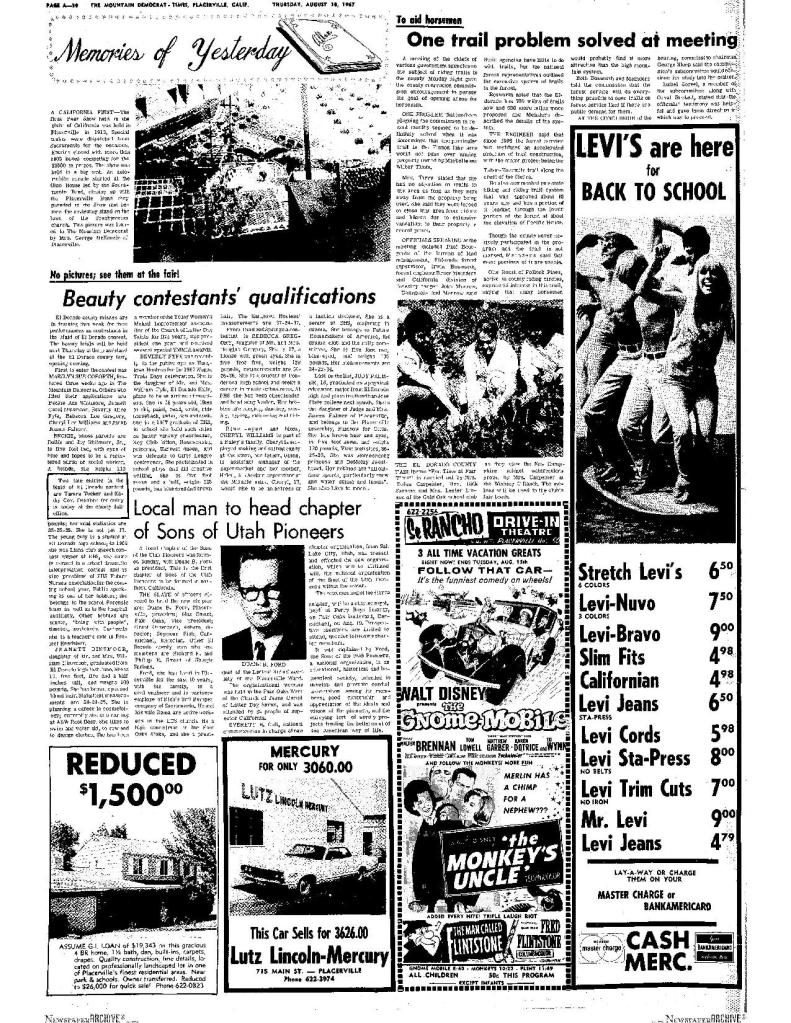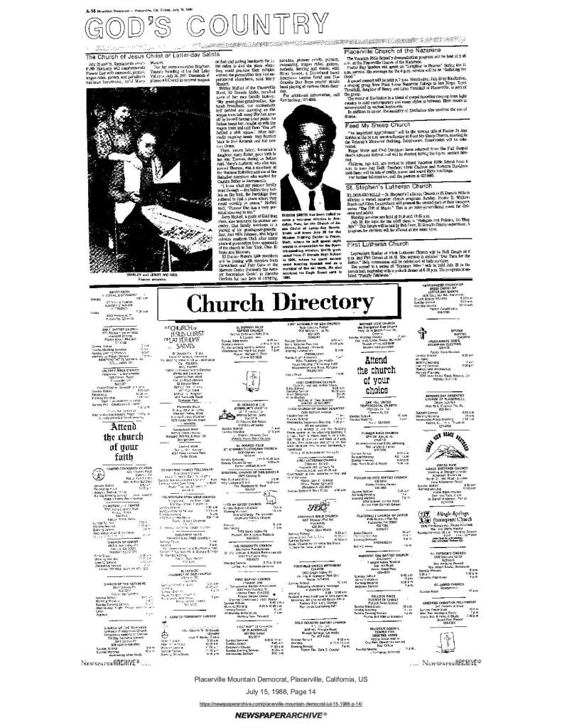 6 Mar 1969, page B-6: Church of Jesus Christ of Latter-day Saints (photo) – Placerville Ward history, begins with Mormon Battalion