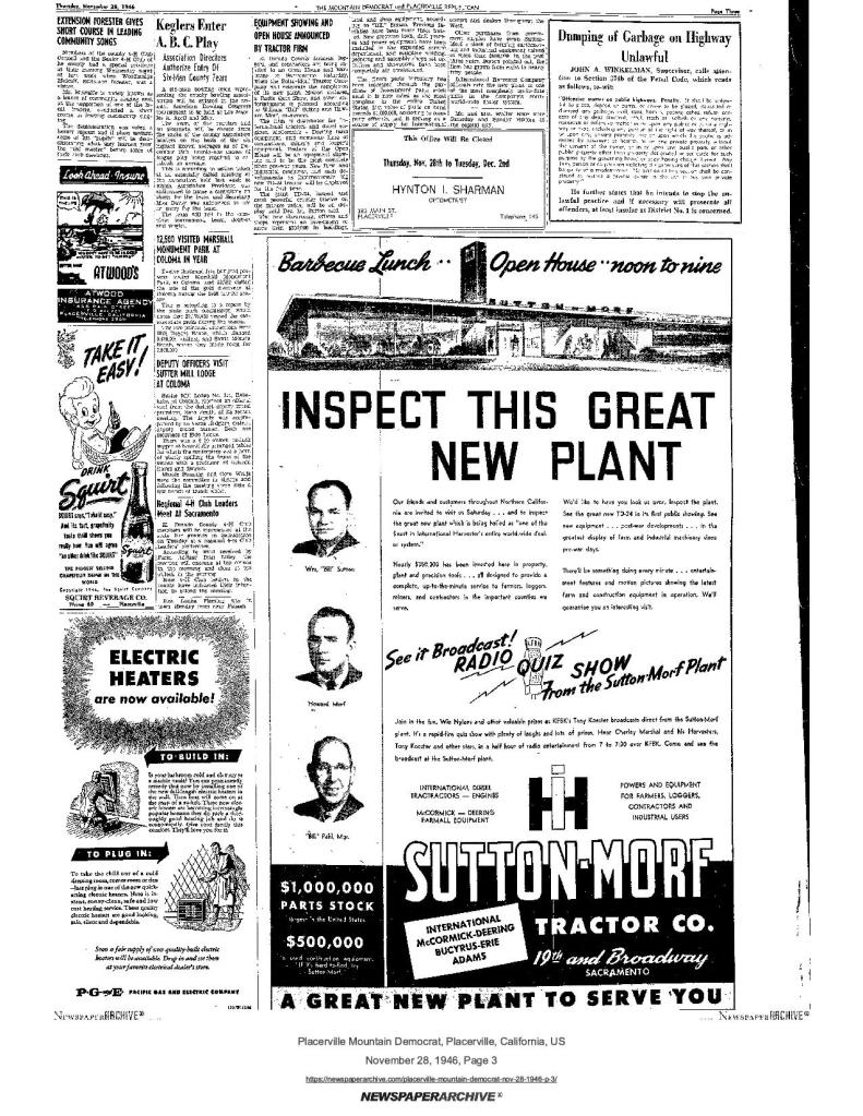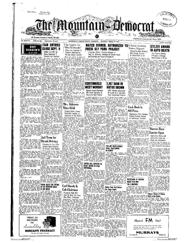 14 Aug 1947, page 1: Sutter Mill depicted in float shown in Centennial Utah – Mance Vaught contacted general authorities about plans for California’s three centennial years