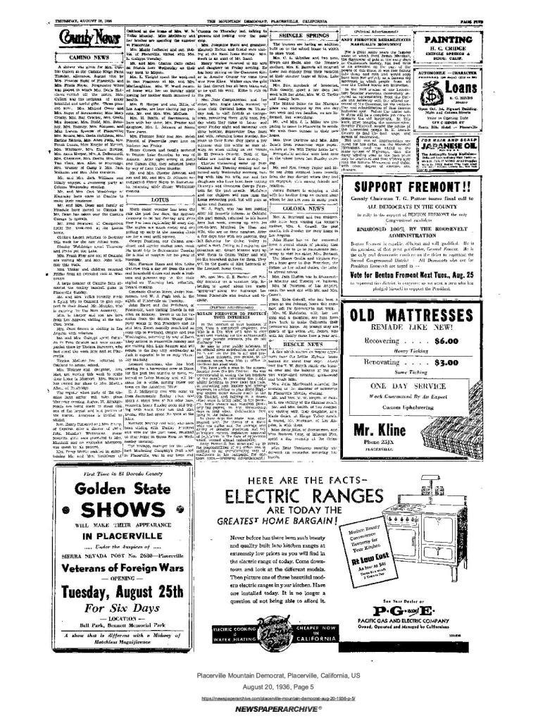 20 Aug 1936, page 5: Andy Pierovich rehabilitates Marshall’s monument – Marshall cabin restoration, road added to State system of Highways