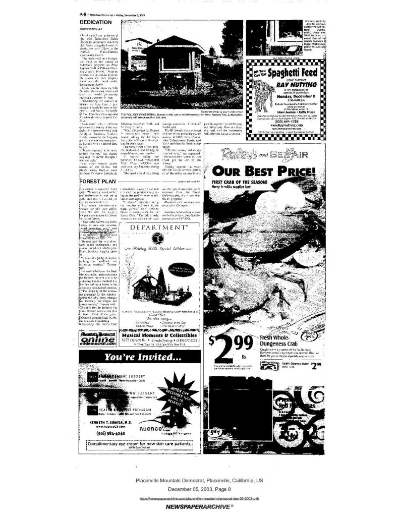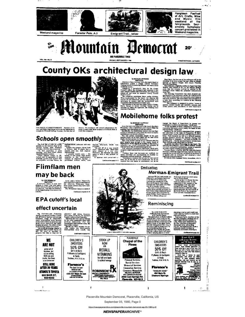 5 December 2003, page A-1: Mural dedication tomorrow – Pollock Pines mural includes Mormon Emigrant Trail panel