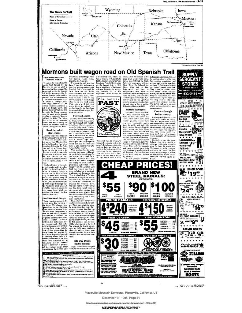 11 Dec 1998, page A-15: Mormons built wagon road on Old Spanish Trail – the 49ers owed a lot to the Mormons, whether they were traveling the northern or southern routes to California during the Gold Rush
