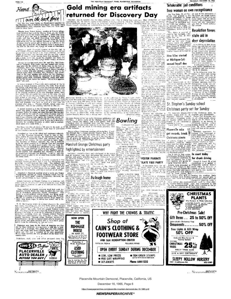 16 Dec 1965, page 6: Gold mining era artifacts returned for Discovery Day (photo) – on loan from The Church of Jesus Christ of Latter-day Saints