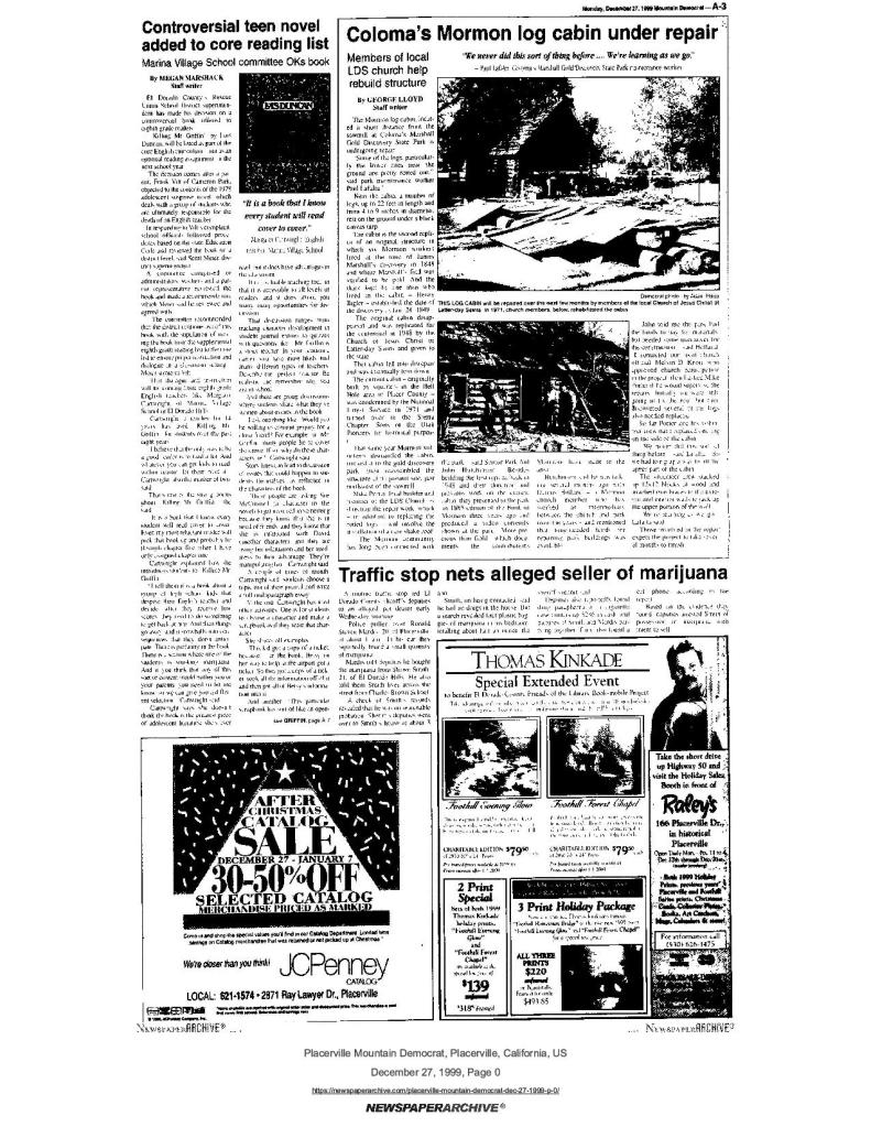 27 Dec 1999, page A-3: Coloma’s Mormon log cabin under repair – Members of local LDS church help rebuild structure – originally replicated by LDS church in 1948 for gold discovery centennial and given to the state, in 1971 given to SUP and rebuilt