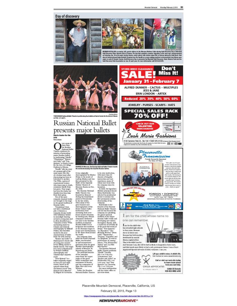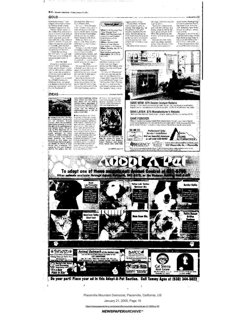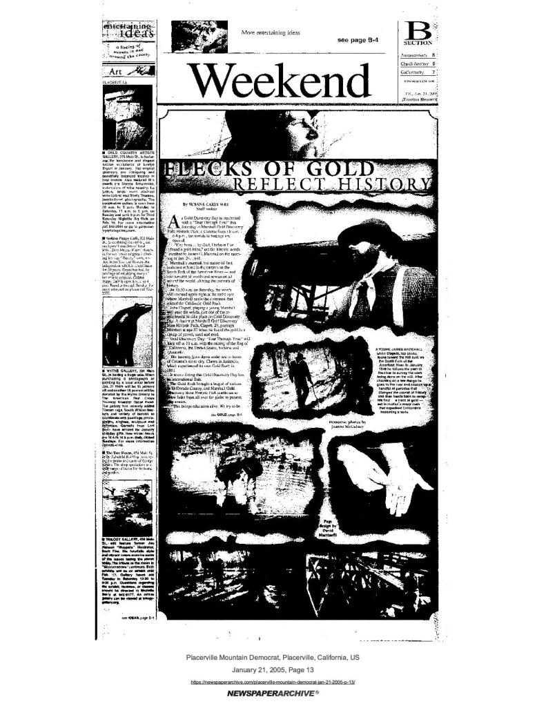21 Jan 2005, page B-1: Flecks of gold reflect history – Gold Discovery Day “Tour Through Time” includes Mormon Cabin presentations