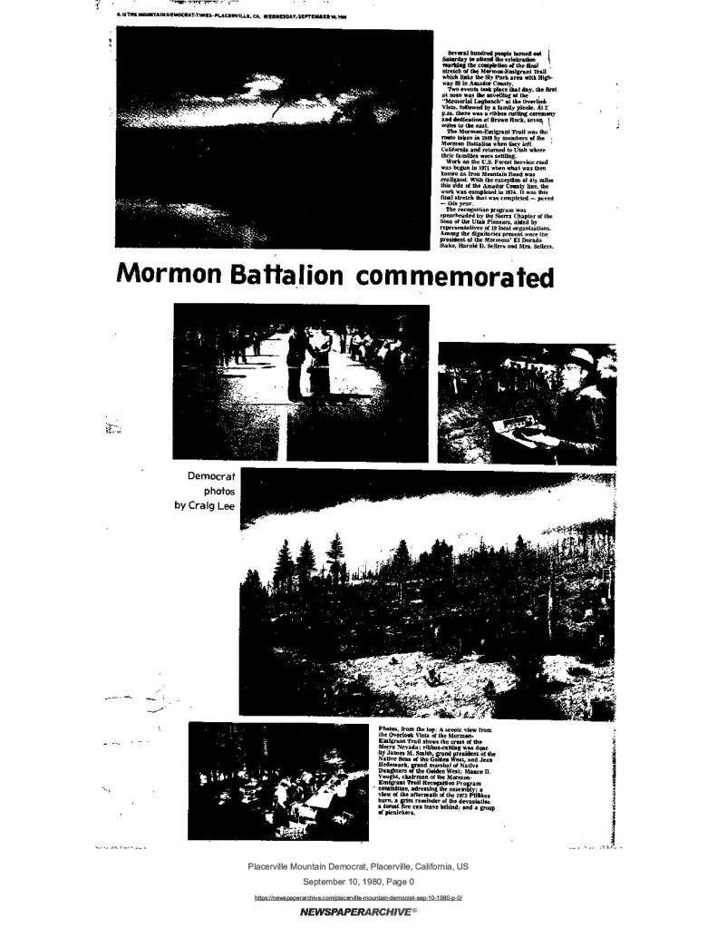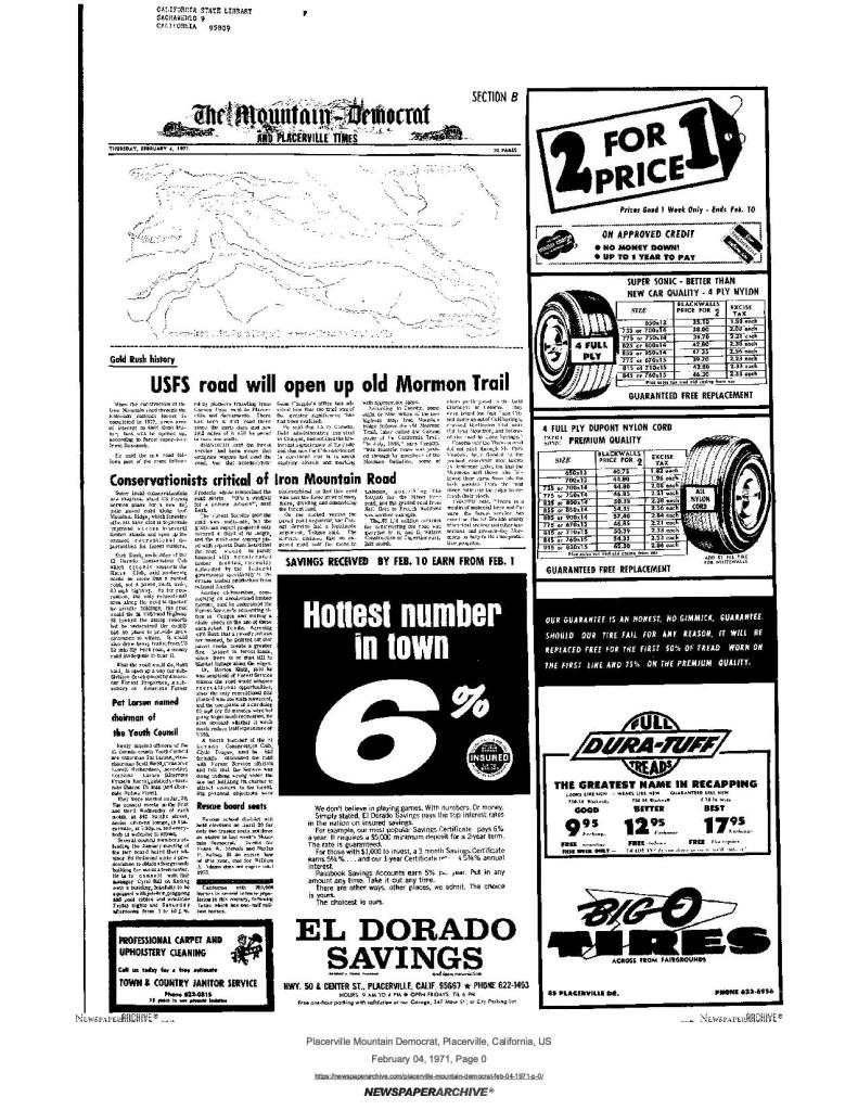 4 Feb 1971, page B-1: Gold Rush history: USFS road will open up old Mormon Trail – of Mormon Battalion members