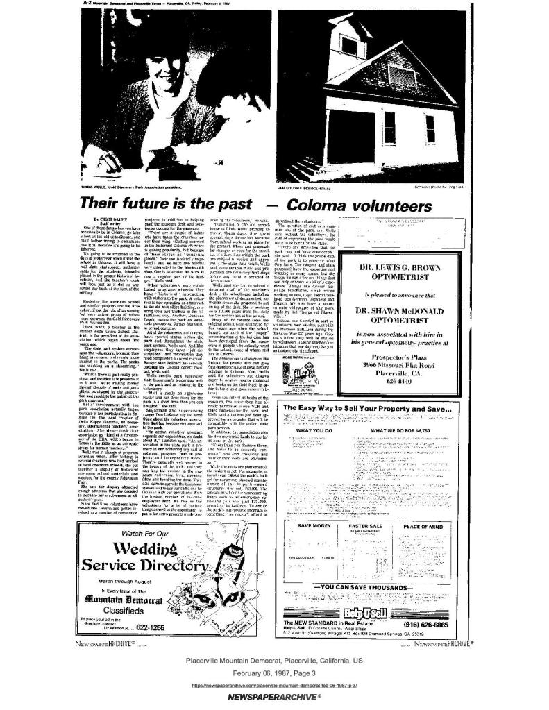 6 Feb 1987, page A-2: Their future is the past – Coloma volunteers – Gold Discovery Park Association activities – Coloma founded in part by volunteers, men who served in the Mormon Battalion