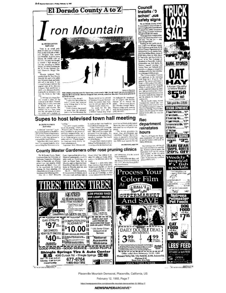 12 Feb 1993, page A-4: Iron Mountain – history of Iron Mountain, Mormon Emigrant Trail, Iron Mountain Ski Resort