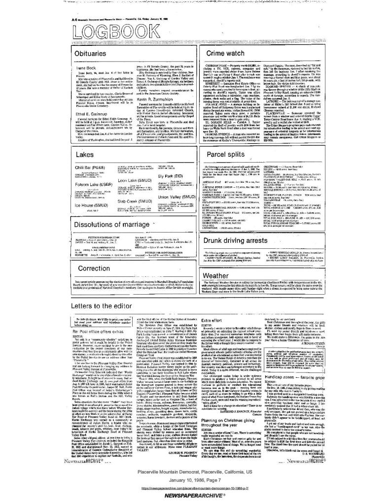 10 Jan 1986, page A-6: Letters to the editor: Post office offers extras – history of local post offices in Mormon Battalion worker-gold discovery period
