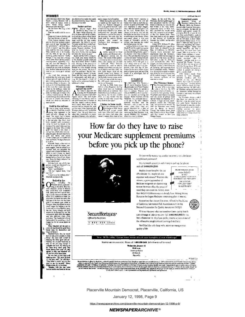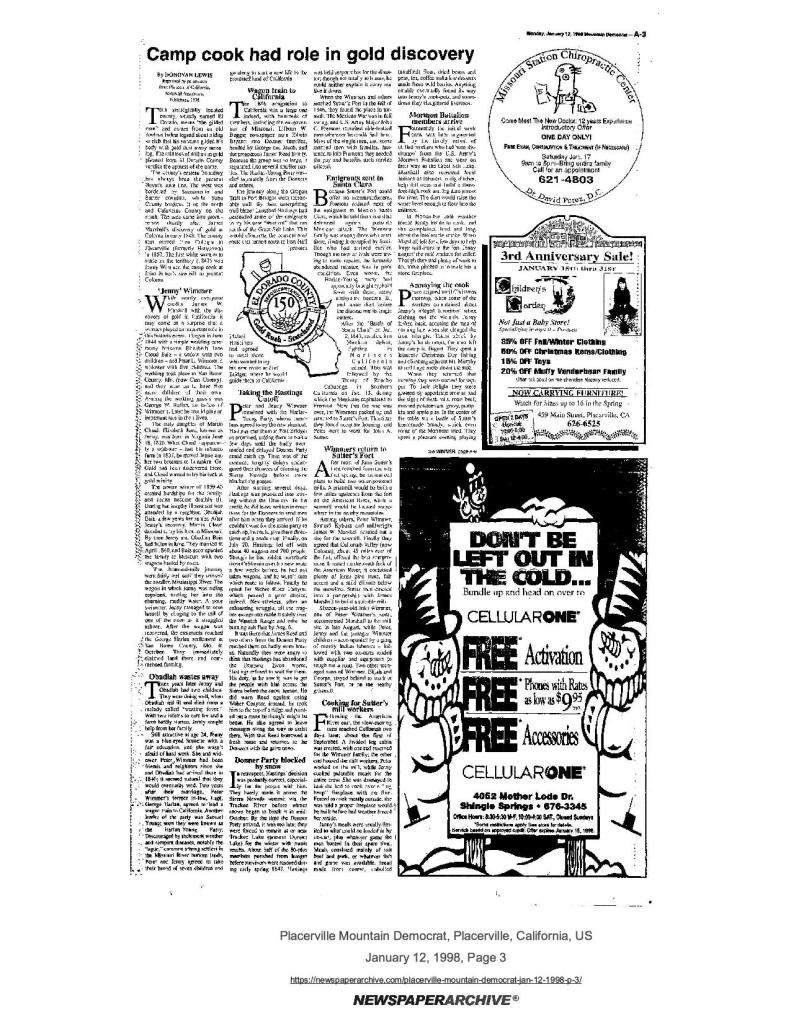 12 Jan 1998, page A-3: Camp cook had role in gold discovery – history of Jenny Wimmer, the camp cook at John Sutter’s sawmill in present Coloma