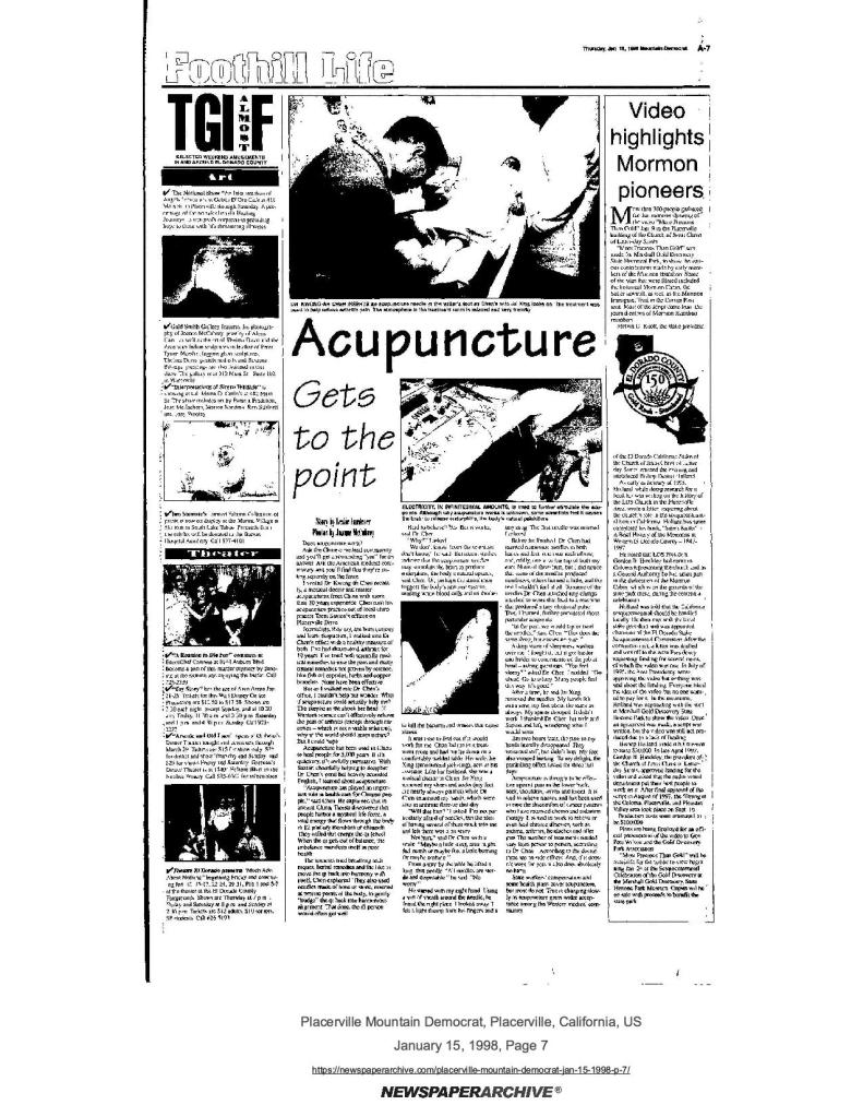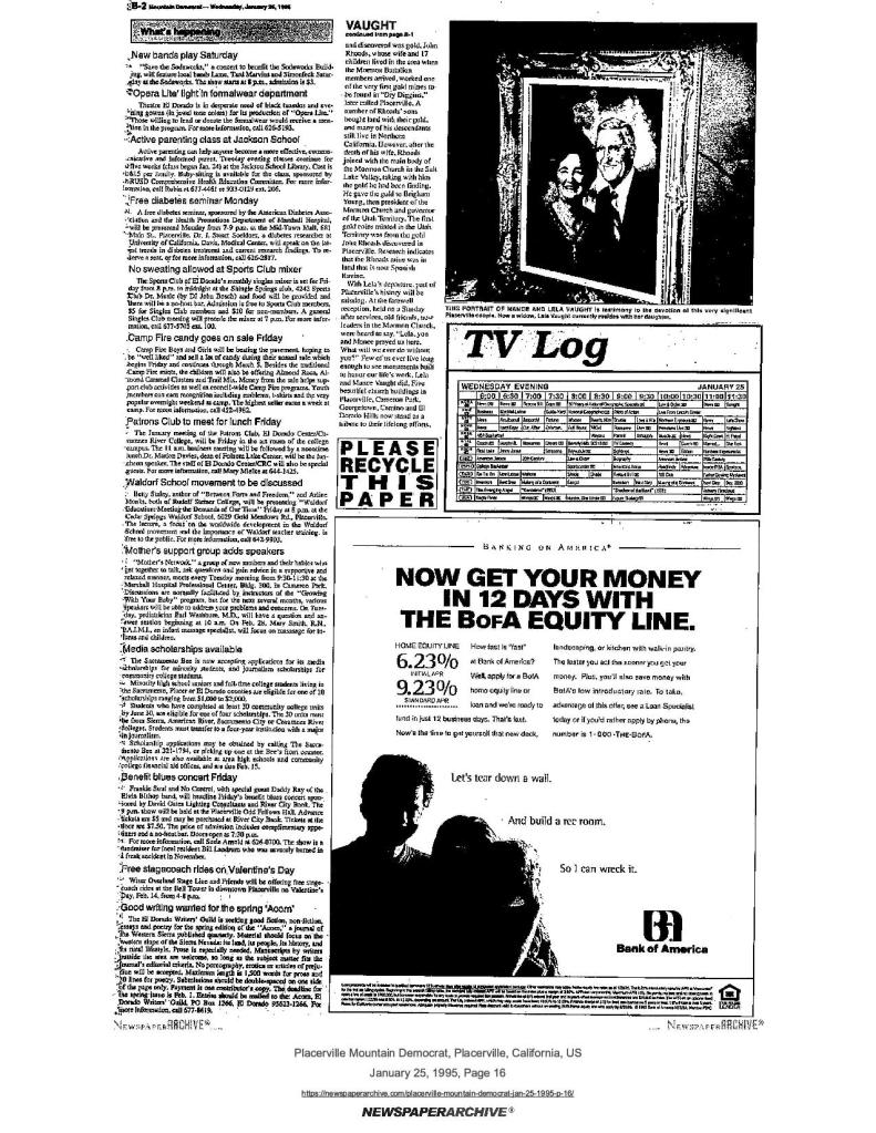 15 Jan 1998, page A-7: Video highlights Mormon pioneers – more than 300 attended premiere of “More Precious Than Gold,” produced by The Church of Jesus Christ of Latter-day Saints for the Gold Discovery Park Association with proceeds to benefit the state parks