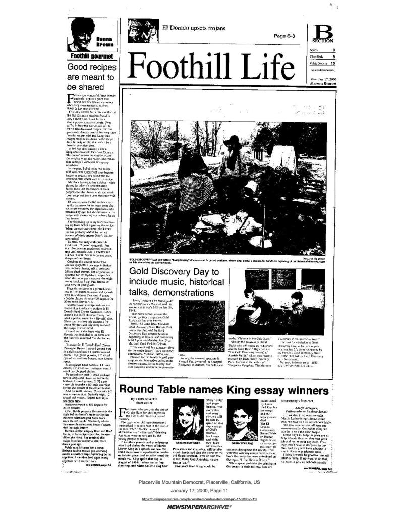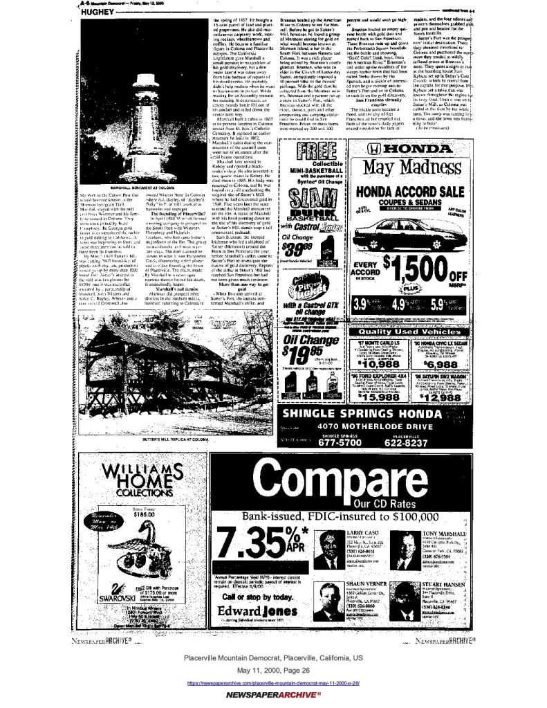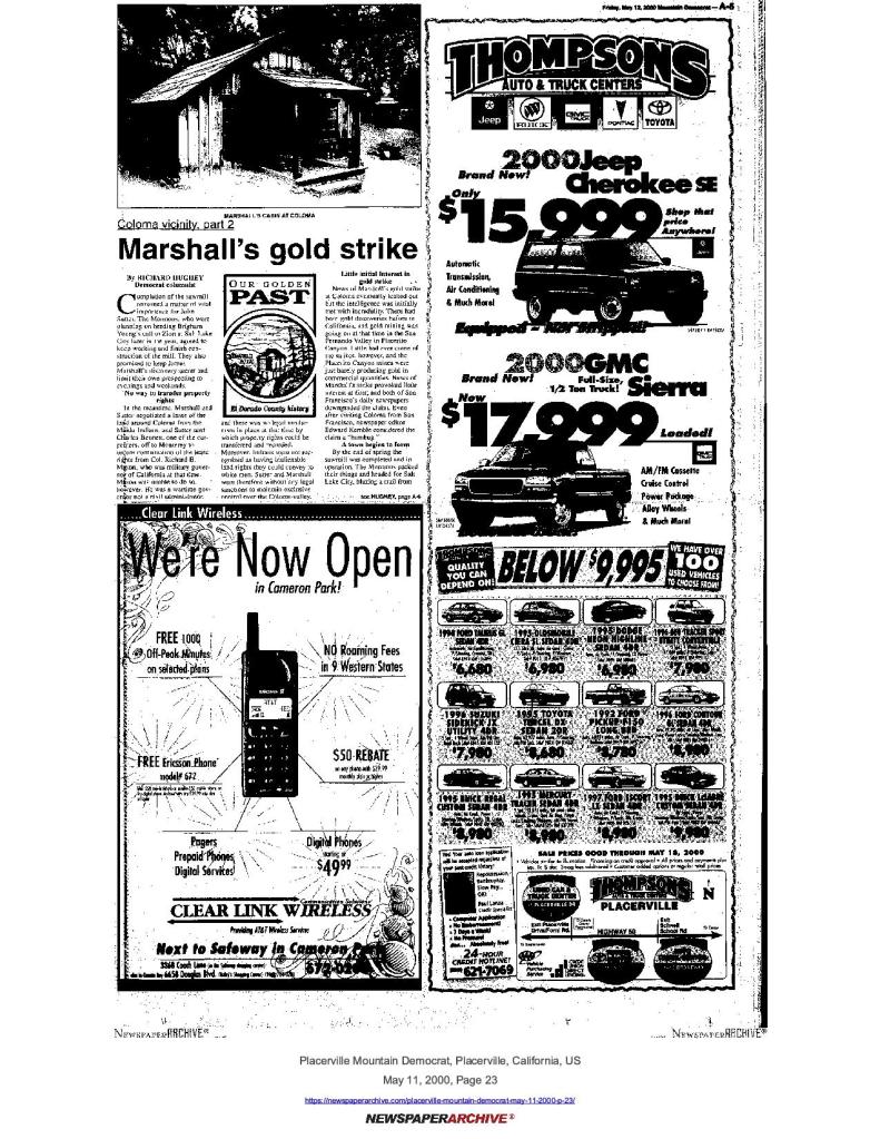 12 May 2000, page A-6: Coloma vicinity, part 2: Marshall’s gold strike – Gold Discovery Day history