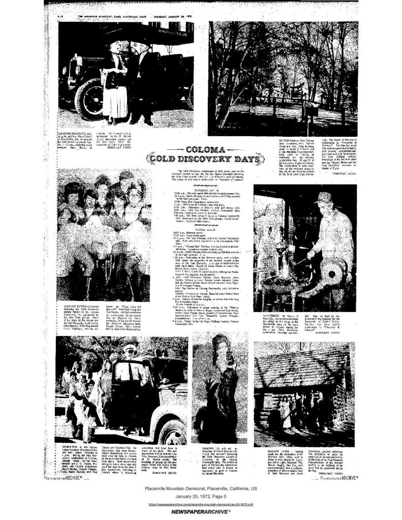 20 Jan 1972, page B-8: Coloma Gold Discovery Days – Mormon Cabin (photo), dedication Sunday at 1 p.m.