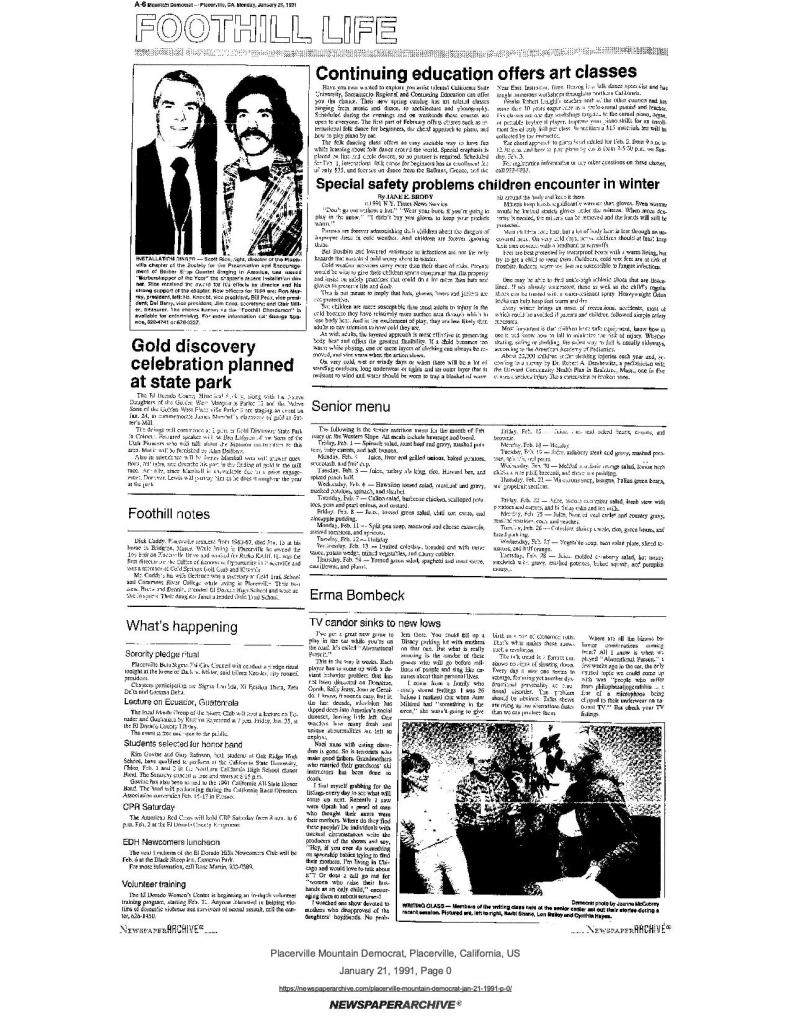 21 Jan 1991, page A-6: Gold discovery celebration planned at state park – staged by multiple historical societies with SUP speaker
