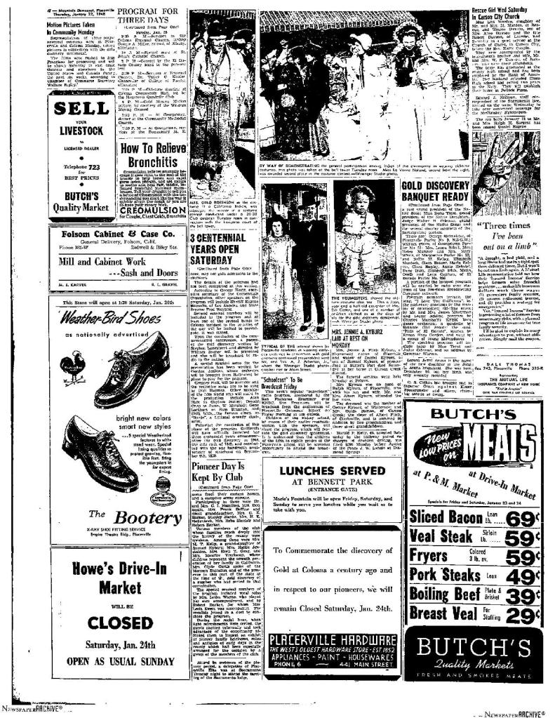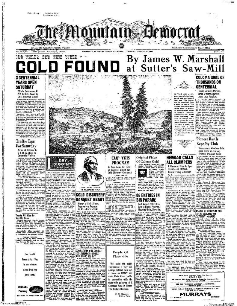 22 Jan 1948, page 1: 3 Centennial years open Saturday – celebrating anniversaries of California 1848 gold discovery, 1849 gold rush, and 1850 statehood