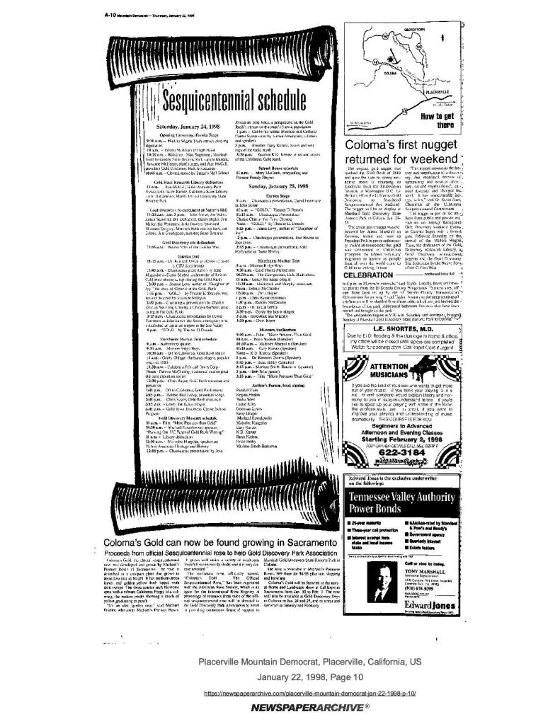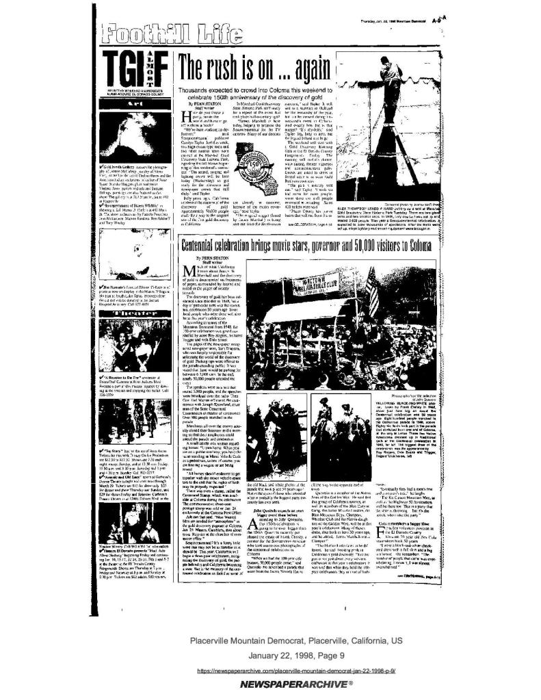 22 Jan 1998, page A-10: Centennial celebration brings movie stars, governor and 50,000 visitors to Coloma – history of centennial celebration, and the sesquicentennial celebration is going to be even bigger event