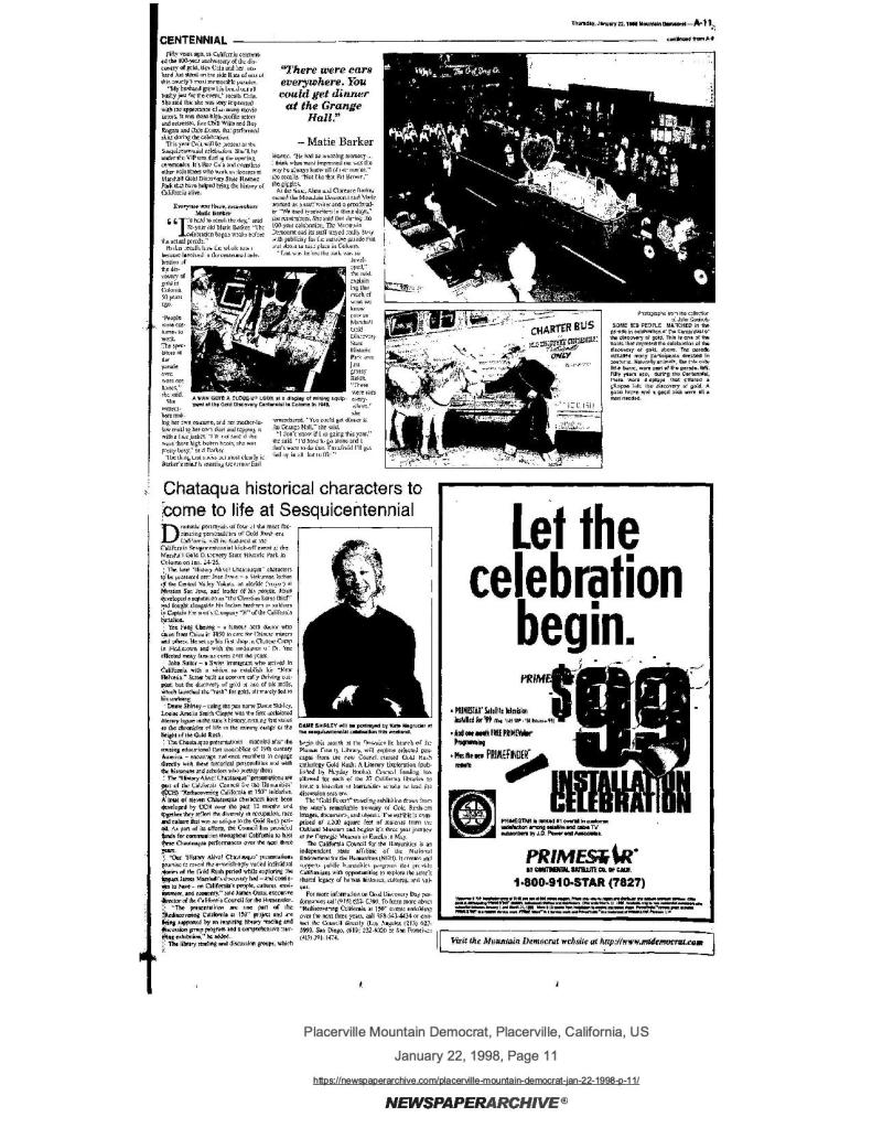 22 Jan 1998, page A-11: Centennial celebration brings movie stars, governor and 50,000 visitors to Coloma – history of centennial celebration, and the sesquicentennial celebration is going to be even bigger event