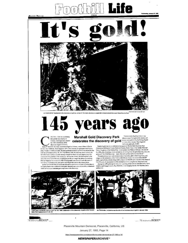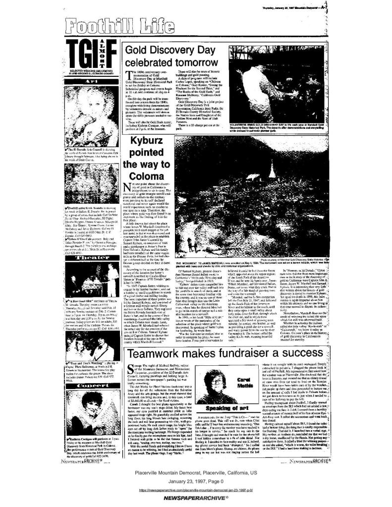 23 Jan 1997, page A-7: Gold Discovery Day celebrated tomorrow – project of California State Parks and multiple historical societies including SUP