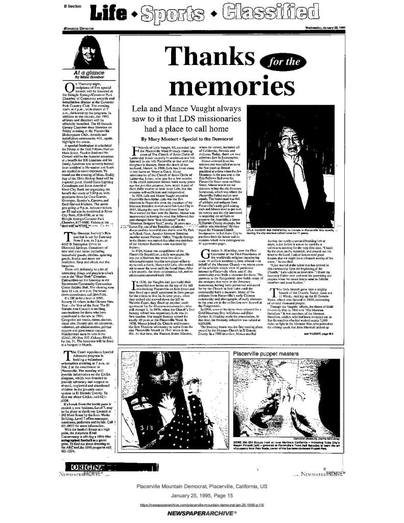25 Jan 1995, page B-1: Thanks for the memories – Lela and Mance Vaught LDS missionaries always had a place to call home