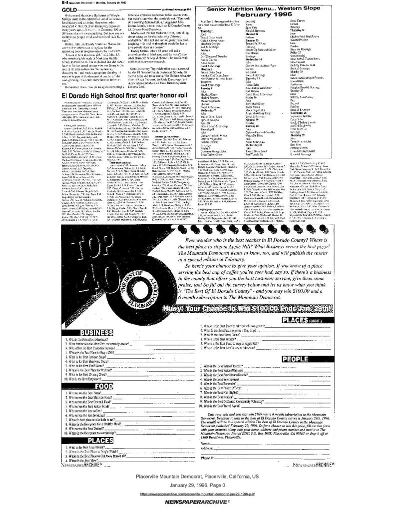 29 Jan 1996, page B-4: Gold, continued from B-3 – sponsored by Marshall Gold Discovery State Park and multiple historical societies, including SUP