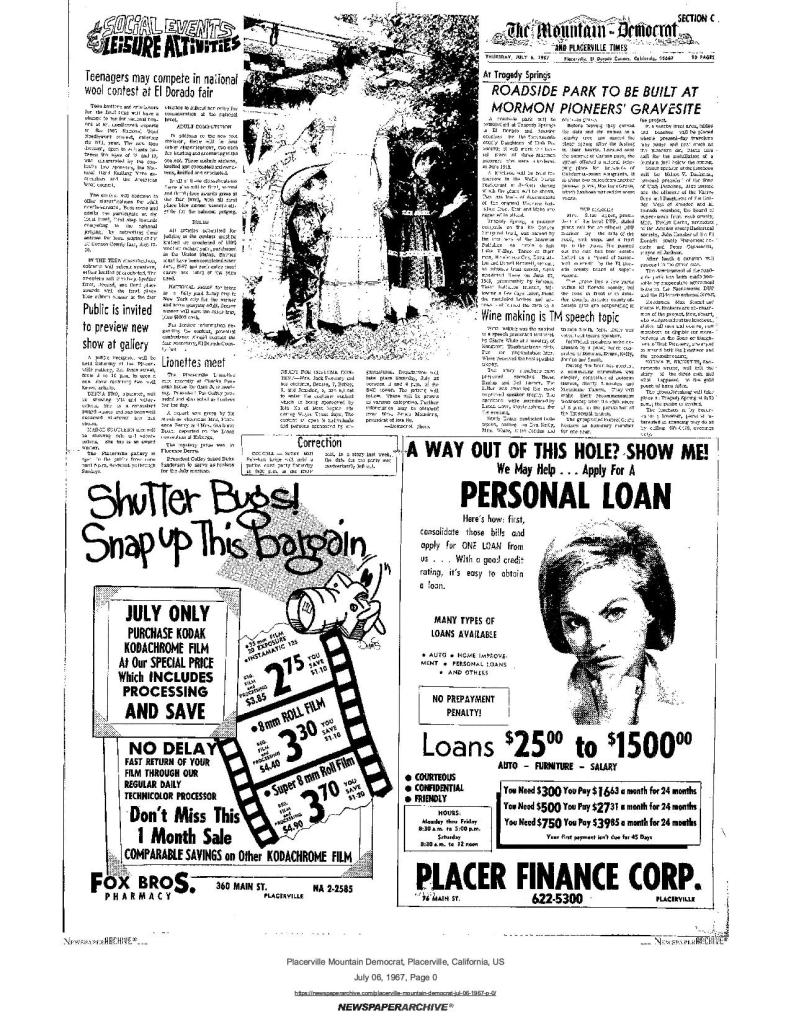 6 Jul 1967, page C-1: Roadside park to be built at Mormon Pioneers’ Gravesite – at Tragedy Spring, by DUP