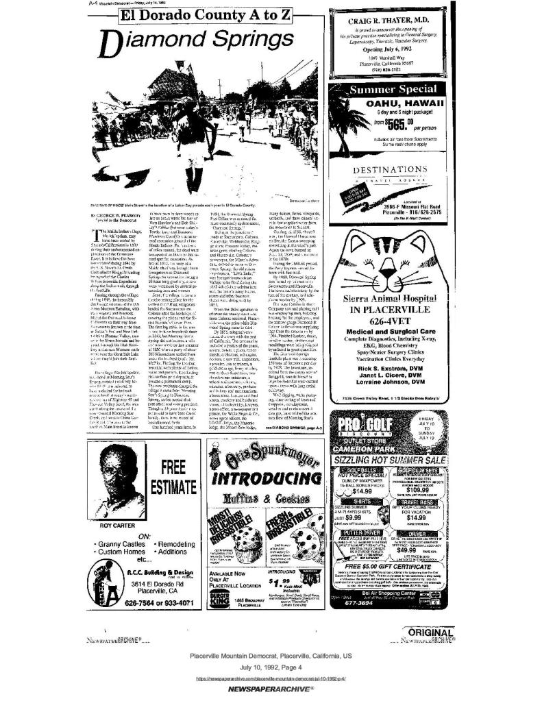 10 Jul 1992, page A-4: Diamond Springs – Road to Diamond Springs was forged by Mormon Battalion in 1848