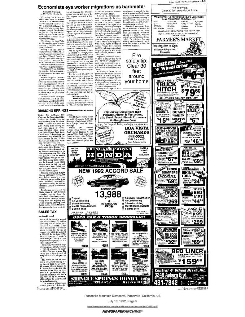 10 Jul 1992, page A-5: Diamond Springs – Road to Diamond Springs was forged by Mormon Battalion in 1848