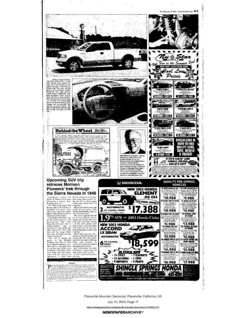 10 July 2003, page B-3: Upcoming SUV trip retraces Mormon Pioneers’ trek through the Sierra Nevada in 1848