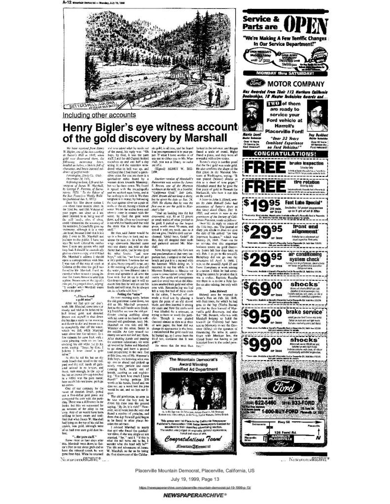 19 Jul 1999, page A-12: Henry Bigler’s eye witness account of the gold discovery by Marshall – a Mormon Battalion member, including other accounts