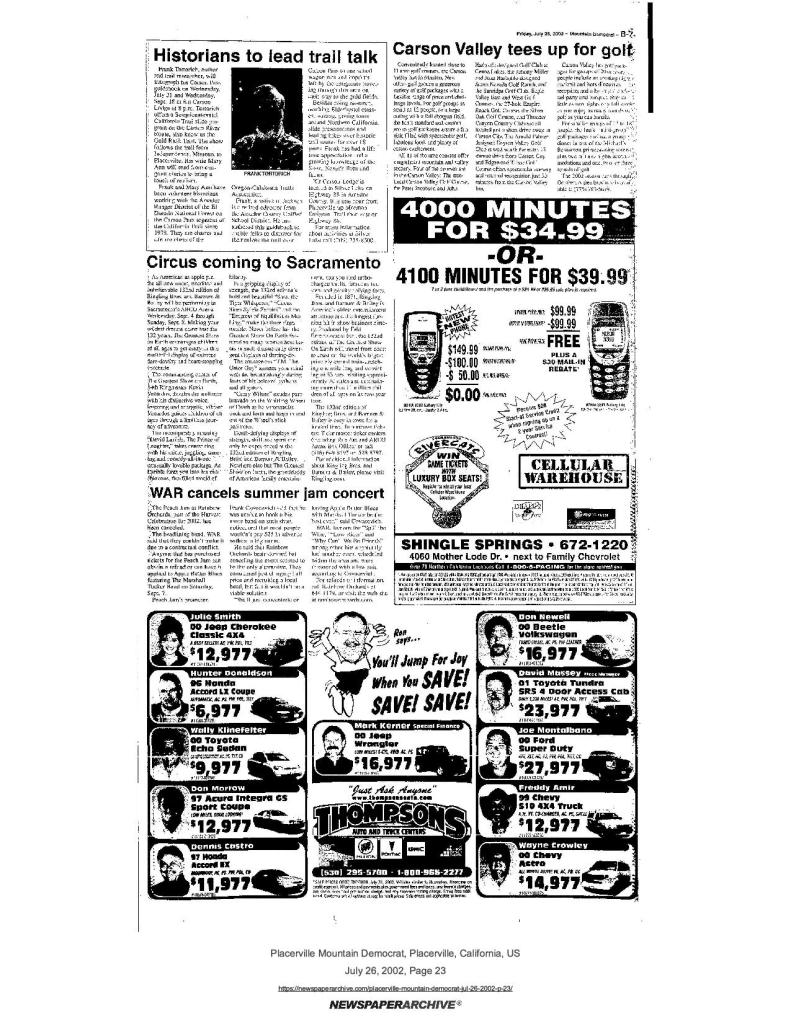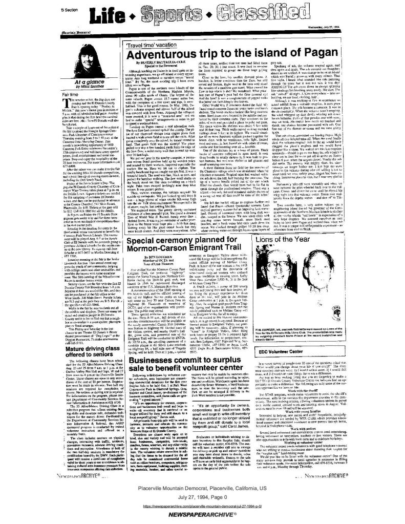26 July 2002, page B-7: Historians to lead trail talk – Carson Pass guidebook author offers slide program