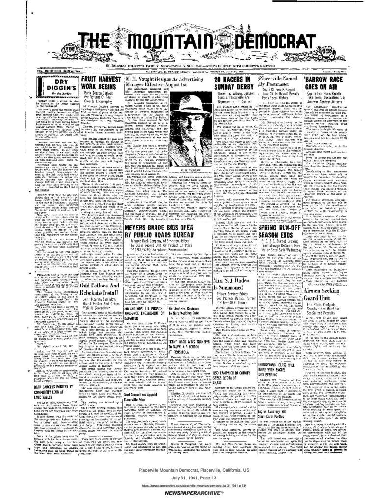 31 Jul 1941, page 1: M.H. Vaught resigns as advertising manager effective August 1st (photo) – called to missionary service in California, Nevada, Arizona