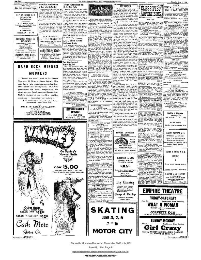 1 Jun 1944, page 8: Farmers automobile insurance, Mance Vaught; Church of Jesus Christ of Latter Day Saints, Mance H. Vaught, Placerville, Branch President