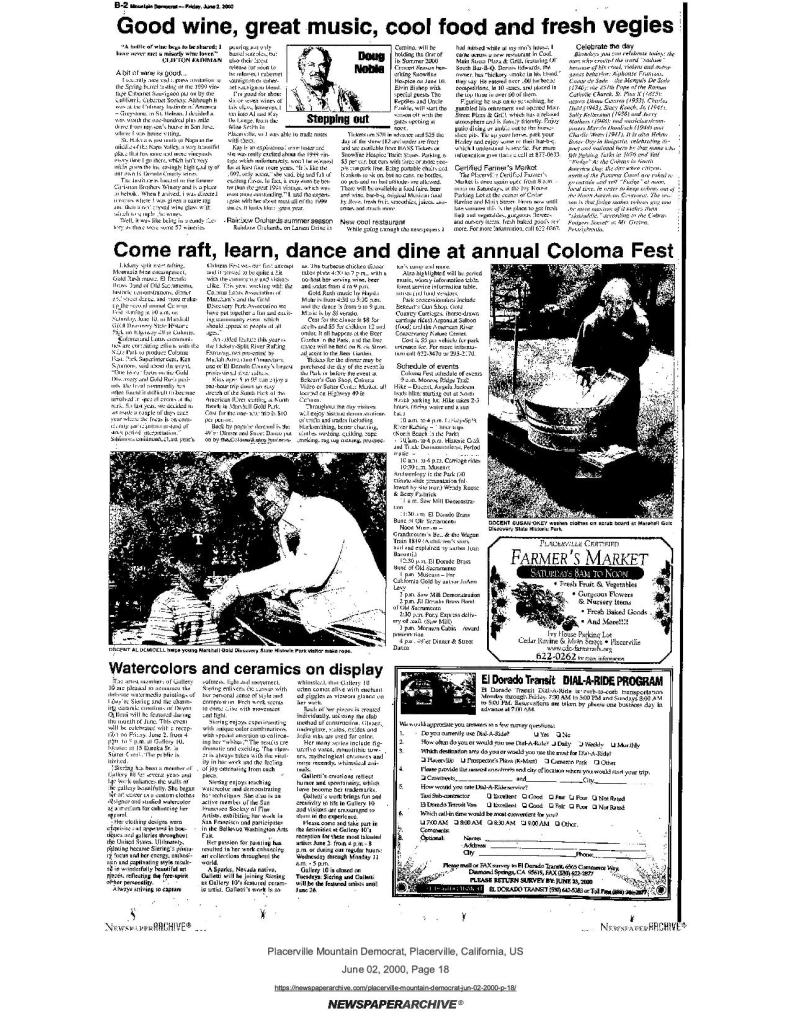 2 June 2000, page B-2: Annual Coloma Fest – second annual festival, Mormon Cabin is included feature