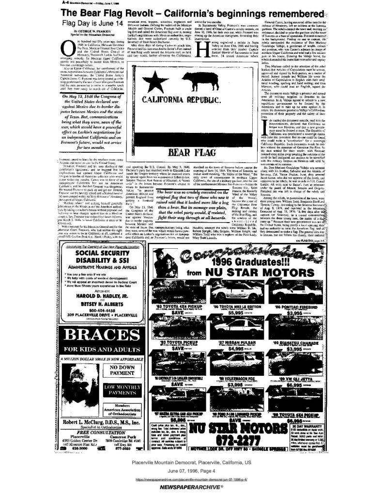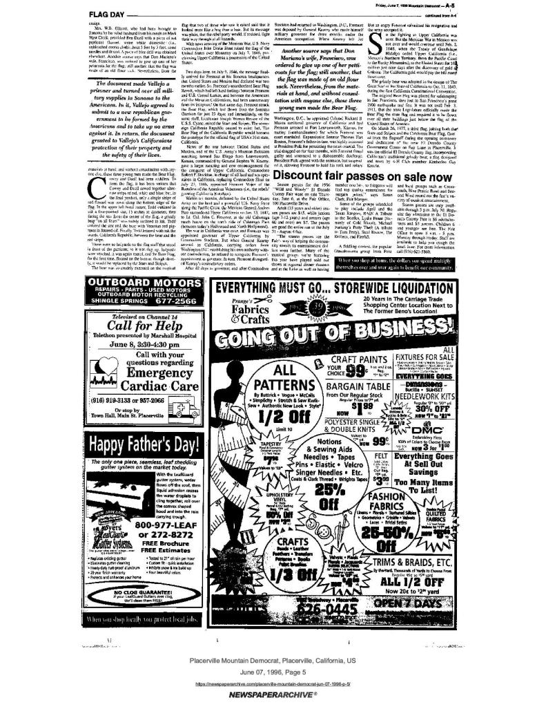7 Jun 1996, page A-5: Flag Day – history of California’s bear flag, and Mormon Battalion involvement in conflict between Kearney and Fremont