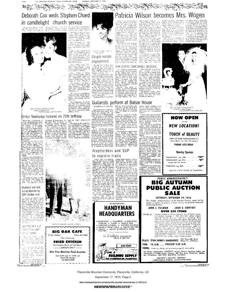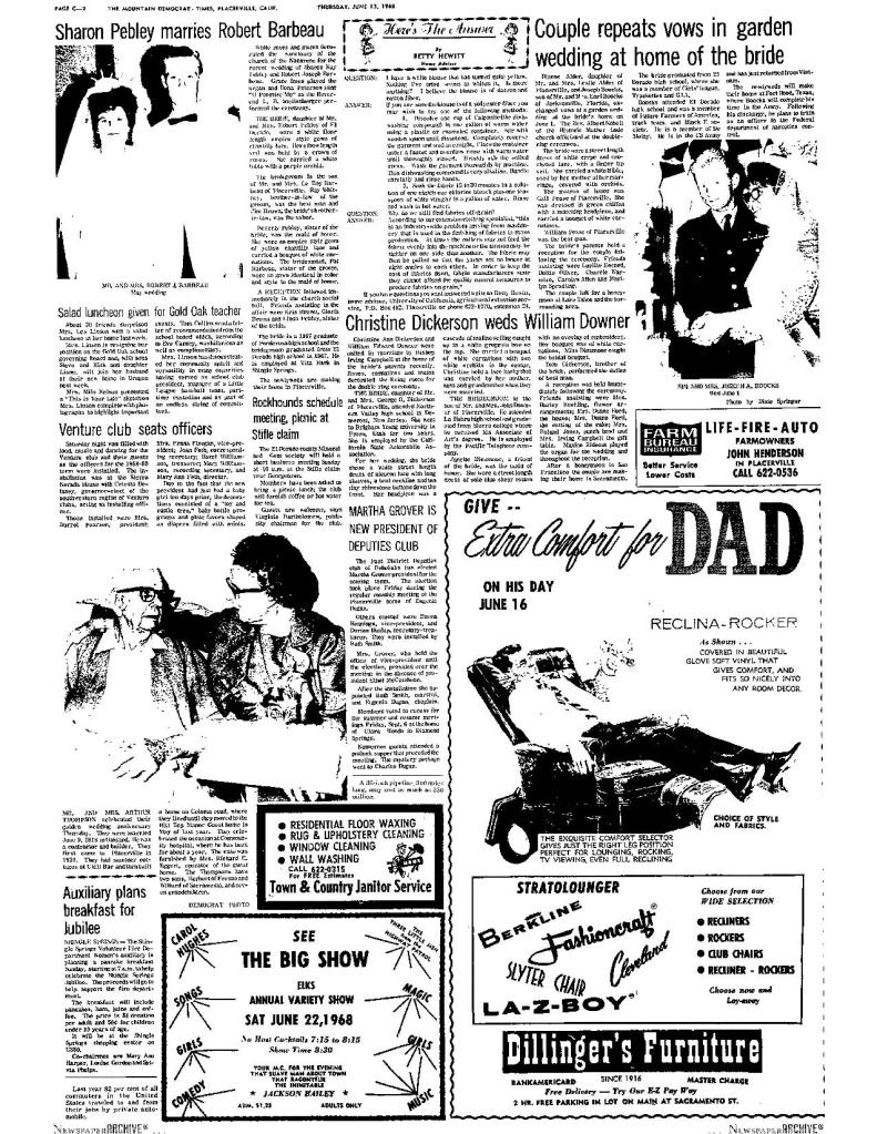 13 Jun 1968, page C-2: Christine Dickerson weds William Downer – Mrs. Duane Ford, supplied the house and cutting of the cake
