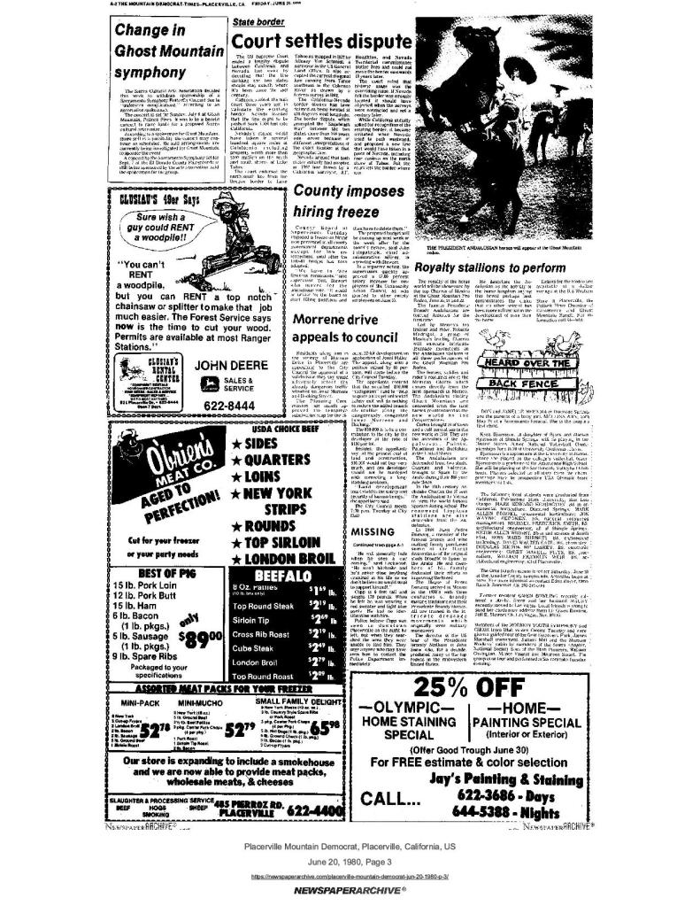 20 Jun 1980, page A-2: Heard over the back fence – members of Utah Mormon Youth Symphony visit Gold Discovery Park in Coloma