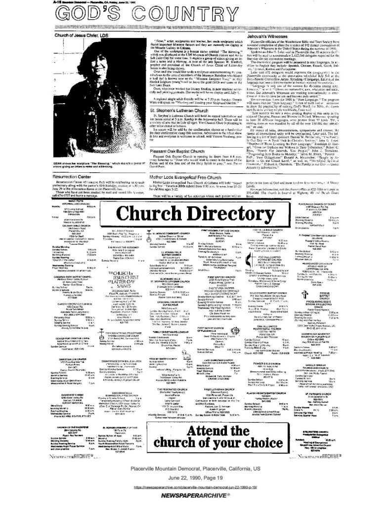 22 Jun 1990, page A-16: Church of Jesus Christ, LDS – Gean, local Mormon artist would like to do a Mormon Battalion sculpture