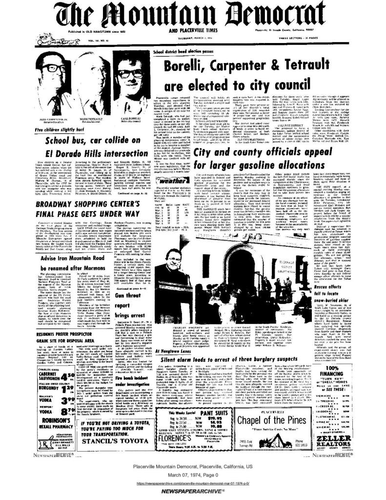 7 Mar 1974, page 1: Advise Iron Mountain Road be renamed after Mormons – to be named Mormon Emigrant Trail, at request of SUP, Sierra chapter