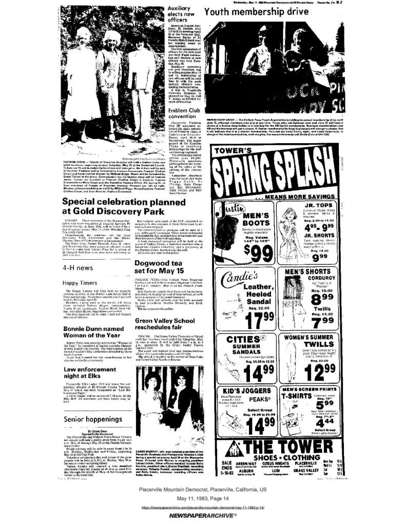 1 Jun 1979, page C-4: Sons of Utah Pioneers plan pilgrimage to Coloma (photo) – annual pilgrimage to Gold Discovery State Park