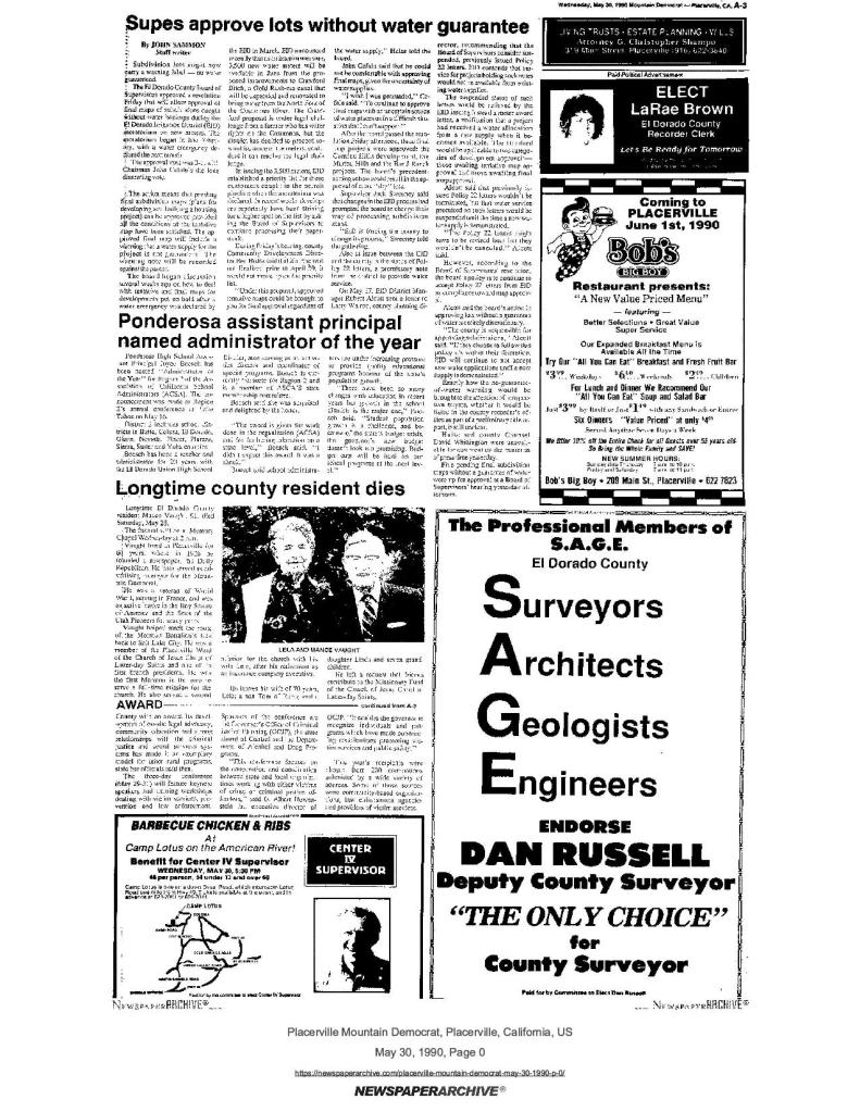 30 May 1990, page A-3: Longtime county resident dies – Mance Vaught, 91, died Saturday, May 28, leaves Lela, wife of 70 years